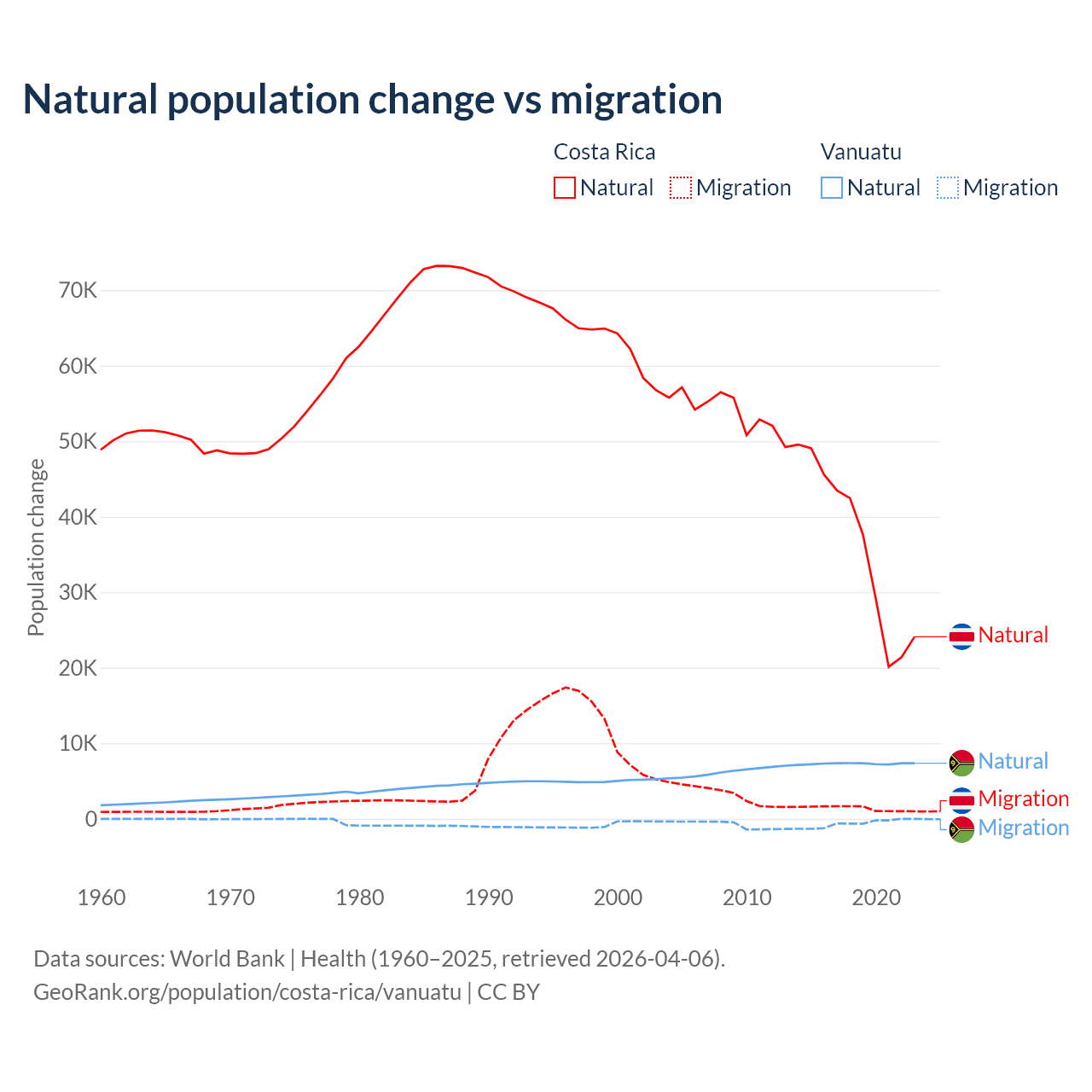 Over the last 10 years, 96.3% of the population change in Costa Rica is from natural causes (a gain of 362,624 people) and 3.69% is from migration (a gain of 13,900 people). In Vanuatu 92.2% is from natural causes (a gain of 72,941 people) and 7.81% is from migration (a loss of 6,181 people).