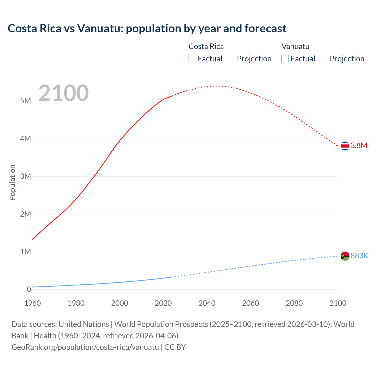 Costa Rica vs Vanuatu: population by year and forecast
