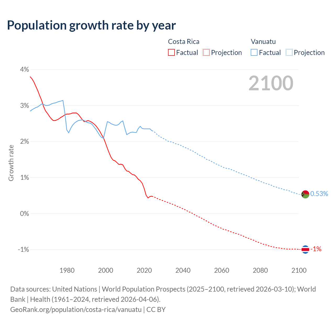 - For the last 10 years, Costa Rica has had an average growth rate of +0.77% per year vs +2.33% in Vanuatu.