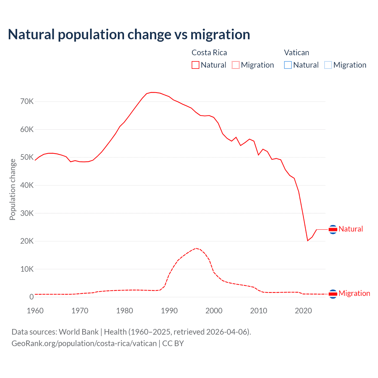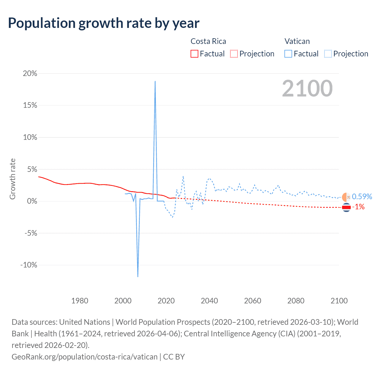 - For the last 10 years, Costa Rica has had an average growth rate of +0.77% per year vs +1.9% in the Vatican.