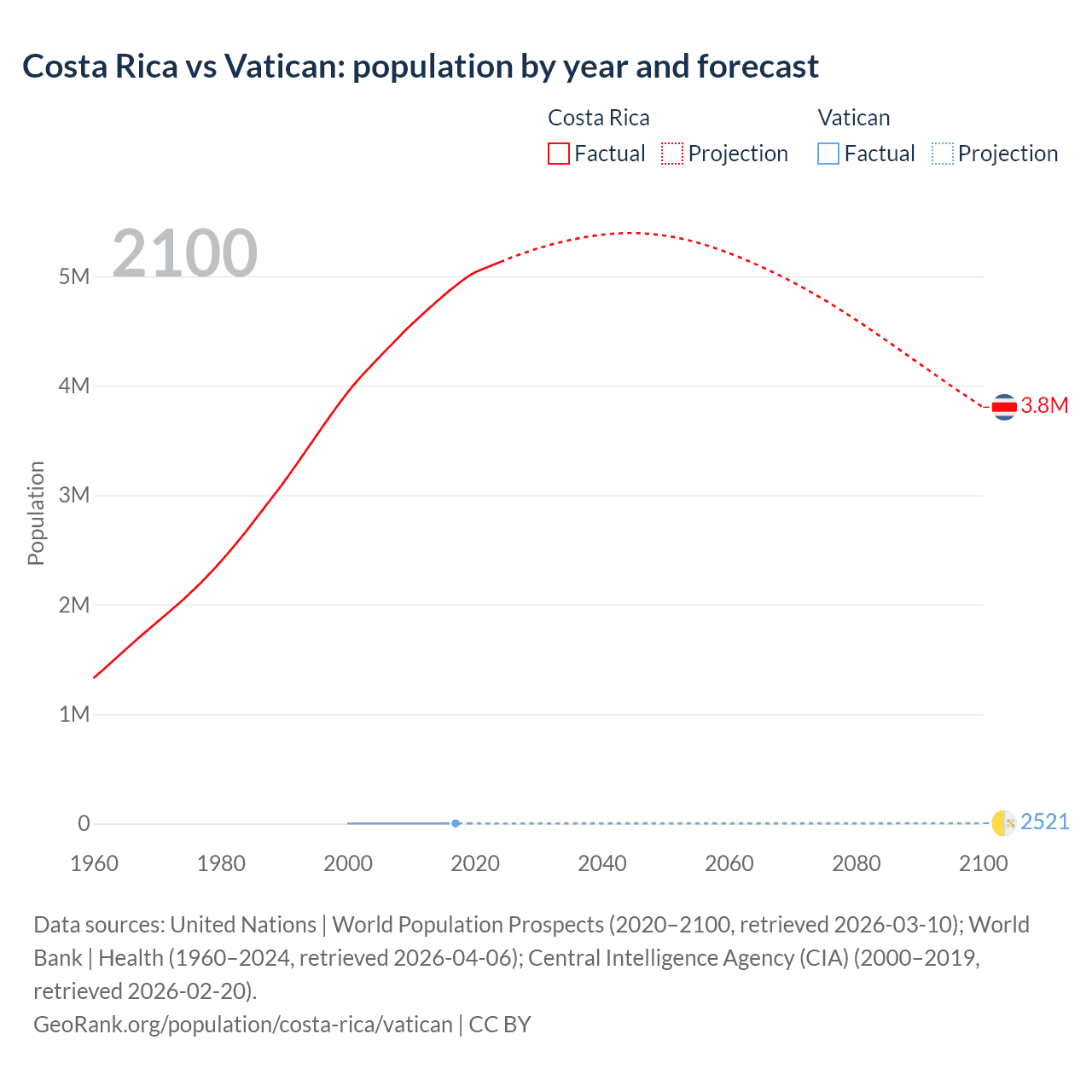 The latest officially reported population of Costa Rica was 5,129,910 in 2024 vs 1,000 people in the Vatican in 2019. In 2026, based on the adjusted UN estimation, the current Costa Rica's population is 5,181,862 people compared to 936 in the Vatican.