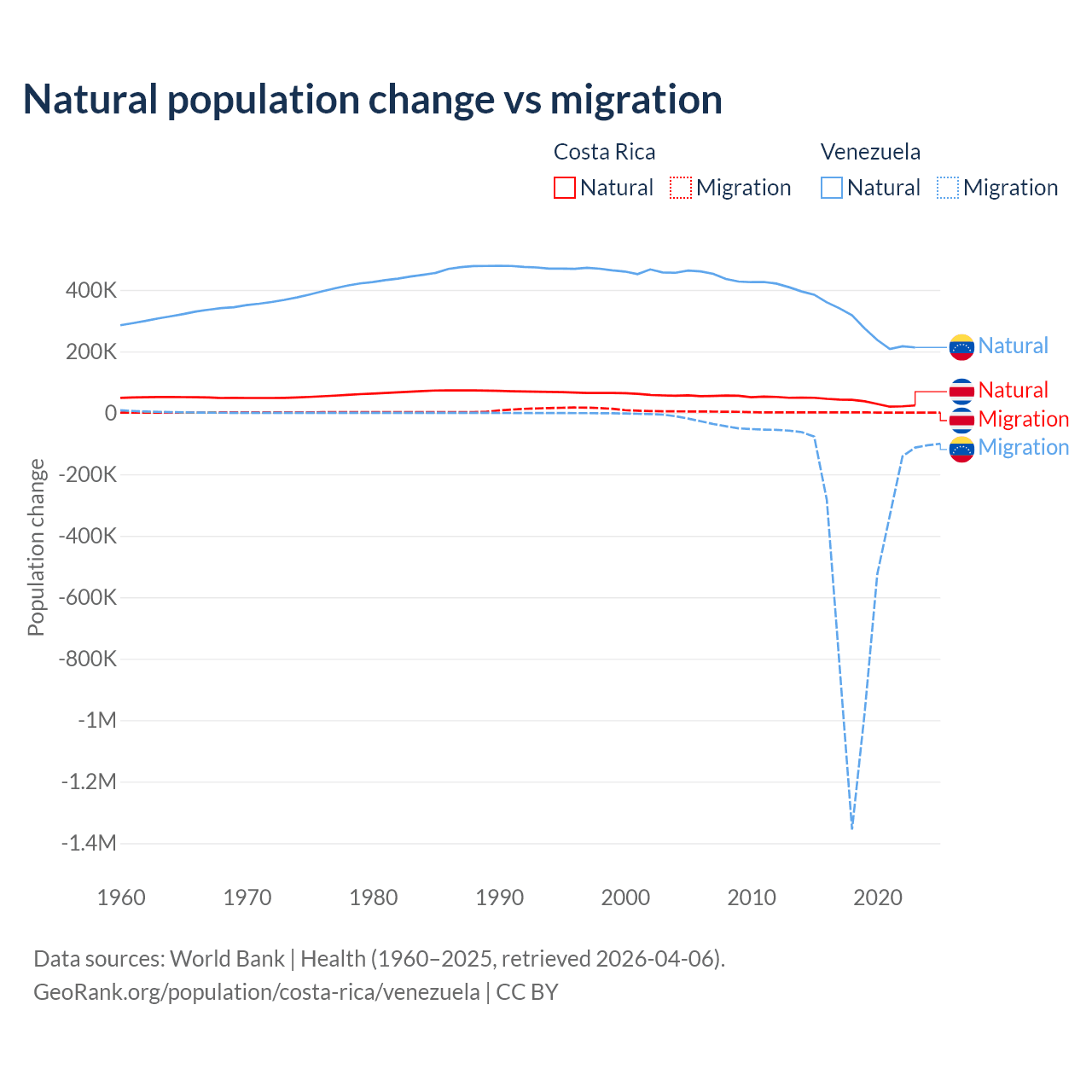 Over the last 10 years, 96.3% of the population change in Costa Rica is from natural causes (a gain of 362,624 people) and 3.69% is from migration (a gain of 13,900 people). In Venezuela 38.6% is from natural causes (a gain of 2,946,257 people) and 61.4% is from migration (a loss of 4,683,227 people).