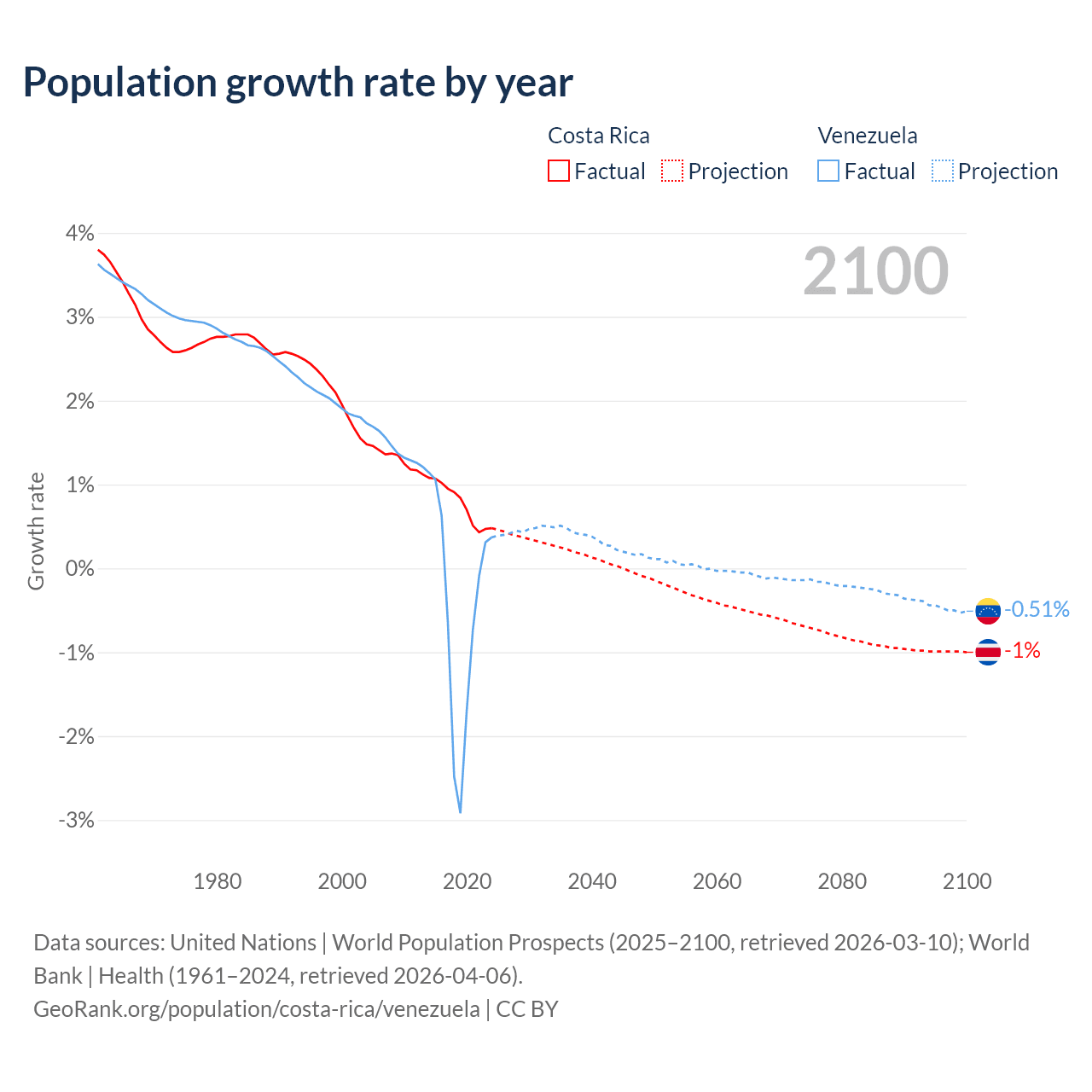 - For the last 10 years, Costa Rica has had an average growth rate of +0.77% per year vs -0.46% in Venezuela.