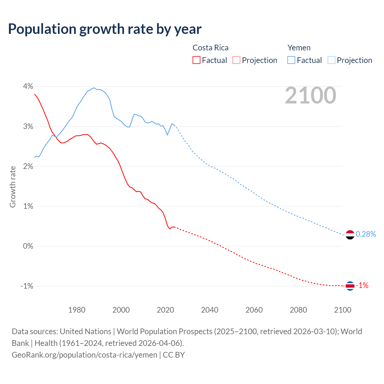 - For the last 10 years, Costa Rica has had an average growth rate of +0.77% per year vs +3% in Yemen.