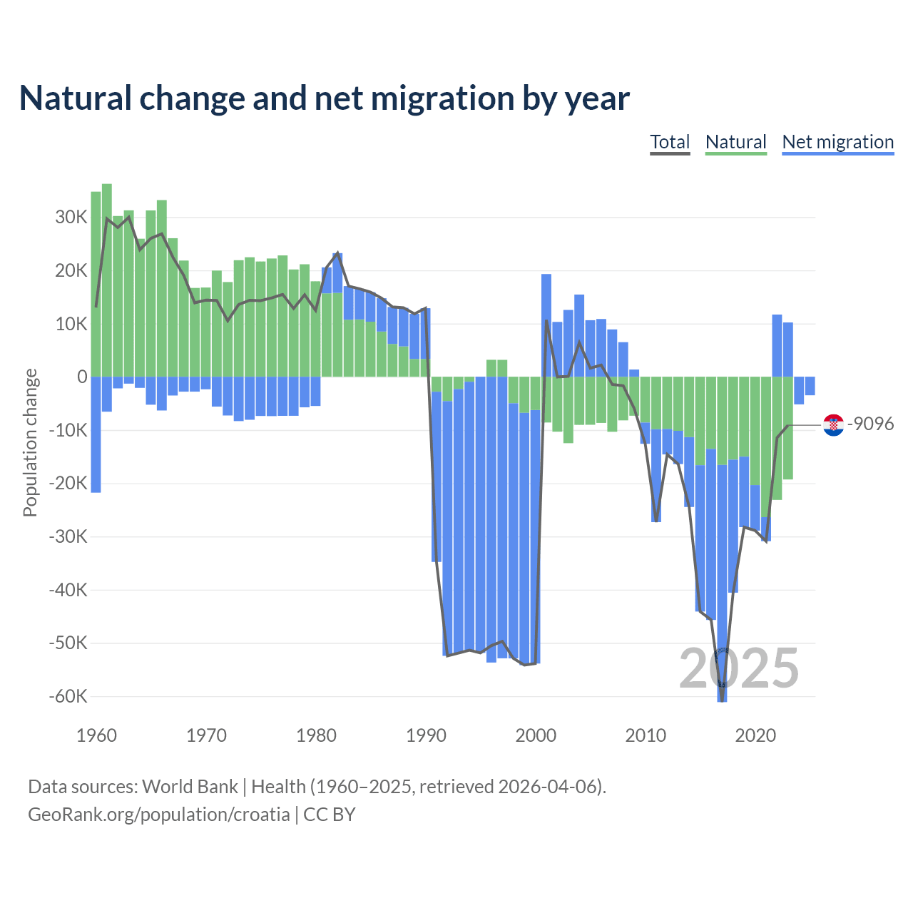 Over the last 10 years, 54.8% of the population change in Croatia is from natural causes (a loss of 177,803 people) and 45.2% is from migration (a loss of 146,770 people).