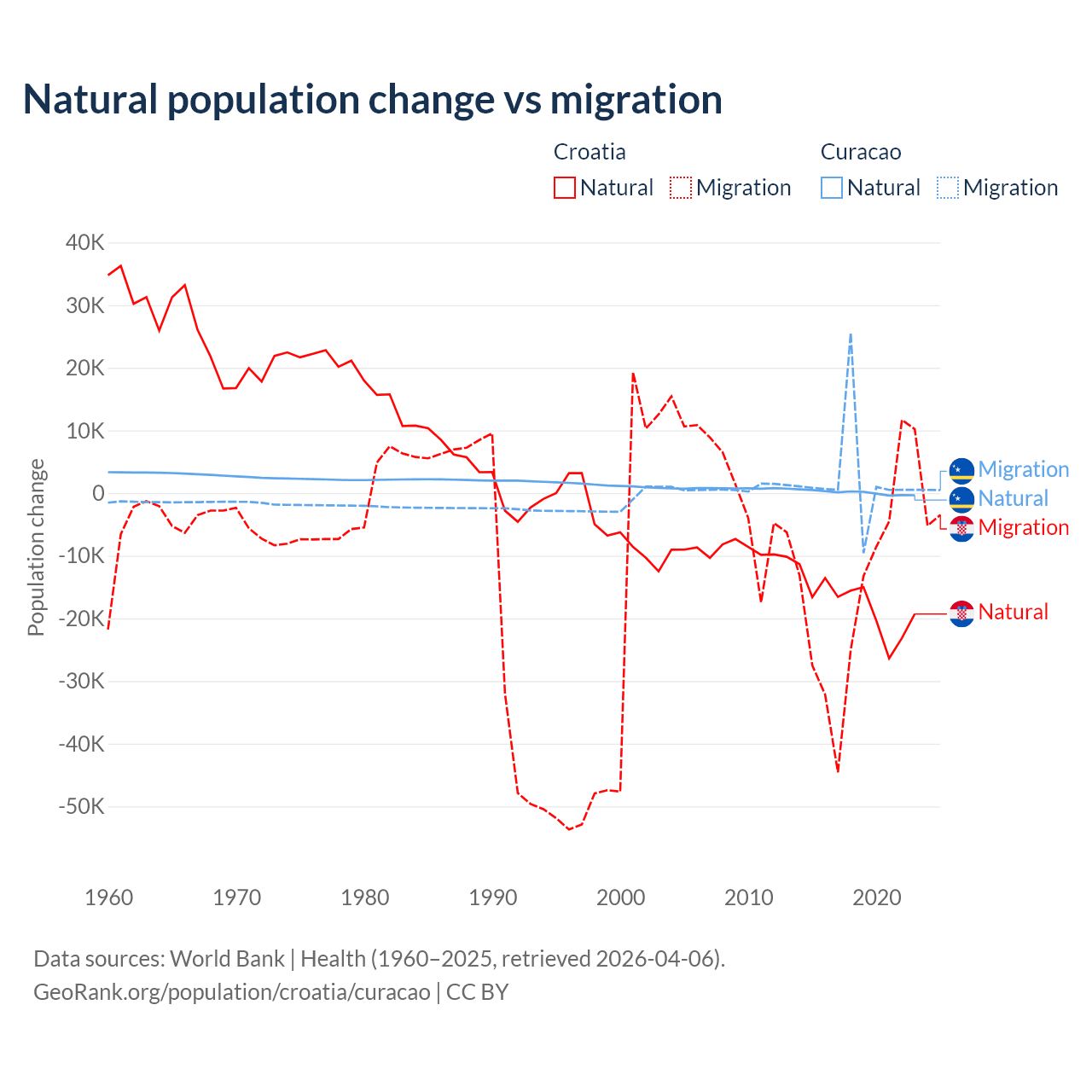 Over the last 10 years, 54.8% of the population change in Croatia is from natural causes (a loss of 177,803 people) and 45.2% is from migration (a loss of 146,770 people). In Curacao 3.72% is from natural causes (a gain of 834 people) and 96.3% is from migration (a gain of 21,615 people).