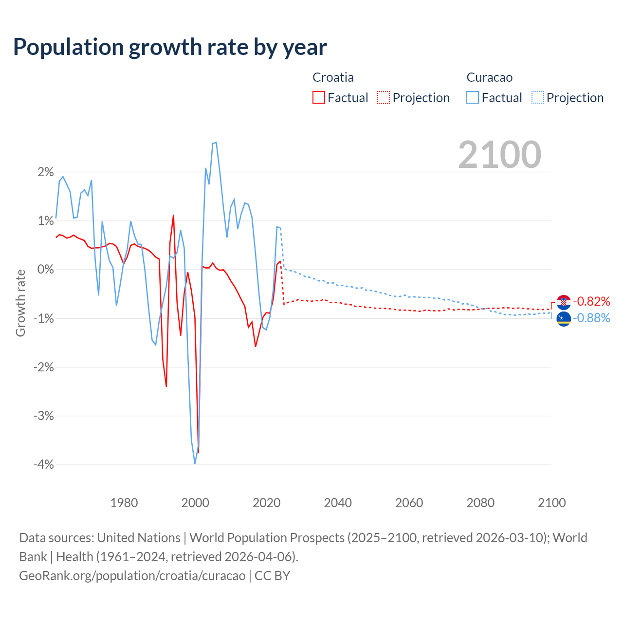 - For the last 10 years, Croatia has had an average growth rate of -0.82% per year vs +0.13% in Curacao.