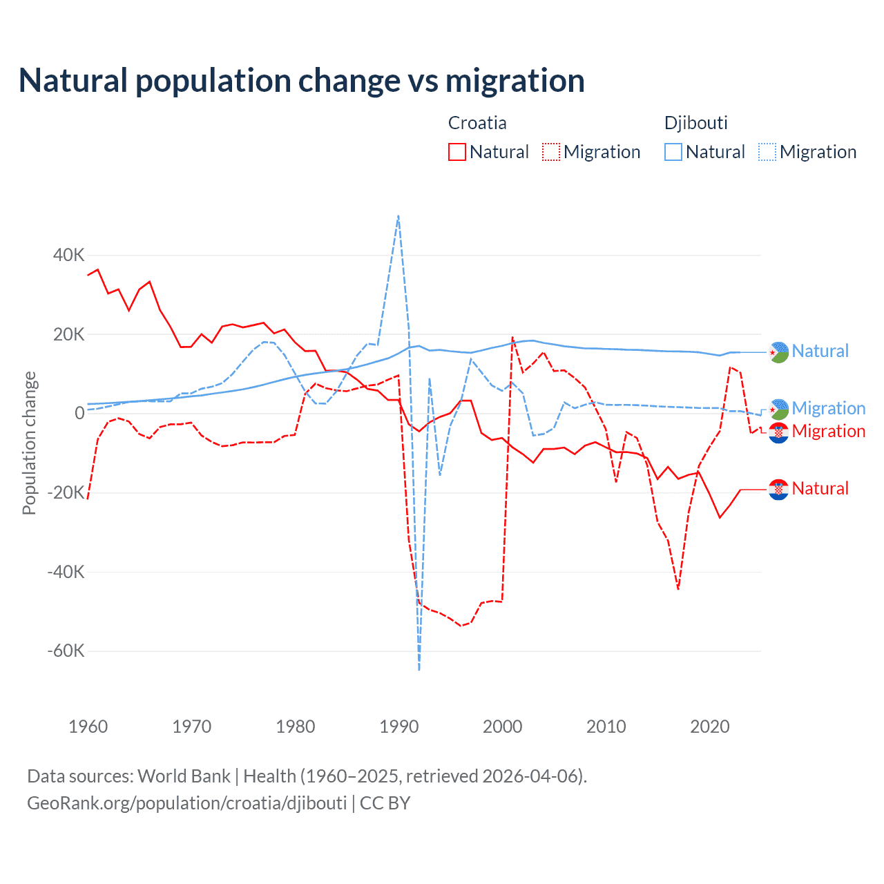 Over the last 10 years, 54.8% of the population change in Croatia is from natural causes (a loss of 177,803 people) and 45.2% is from migration (a loss of 146,770 people). In Djibouti 92.1% is from natural causes (a gain of 153,892 people) and 7.87% is from migration (a gain of 13,138 people).
