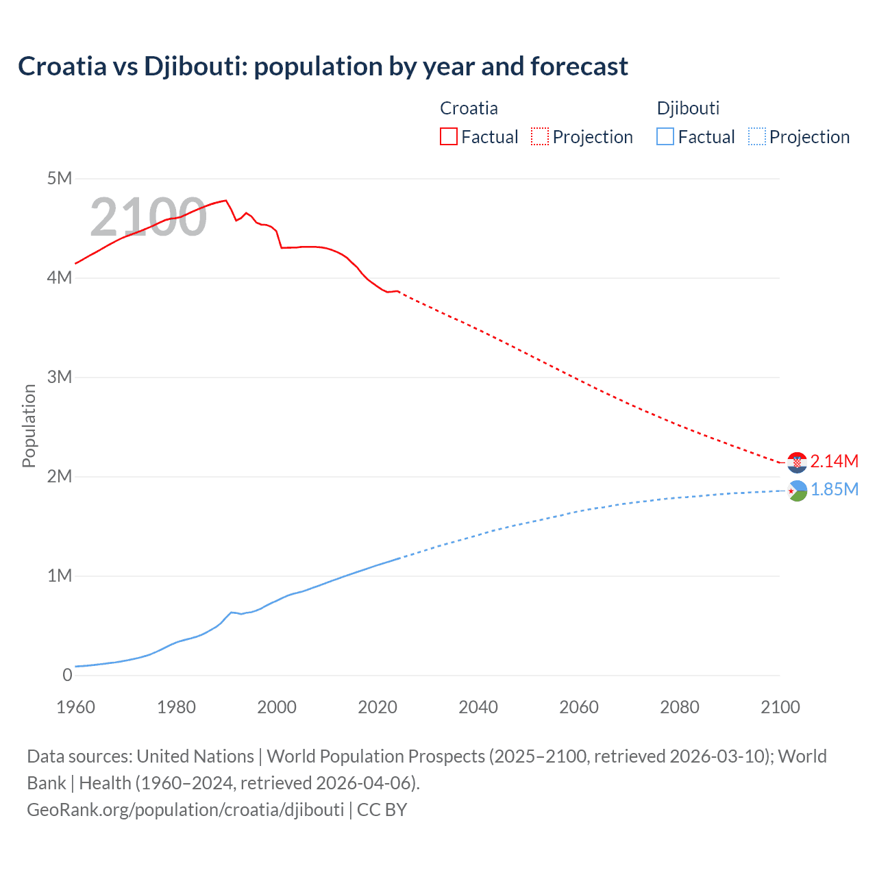 The latest officially reported population of Croatia was 3,866,200 in 2024 vs 1,168,722 people in Djibouti in 2024. In 2026, based on the adjusted UN estimation, the current Croatia's population is 3,812,193 people compared to 1,203,929 in Djibouti.