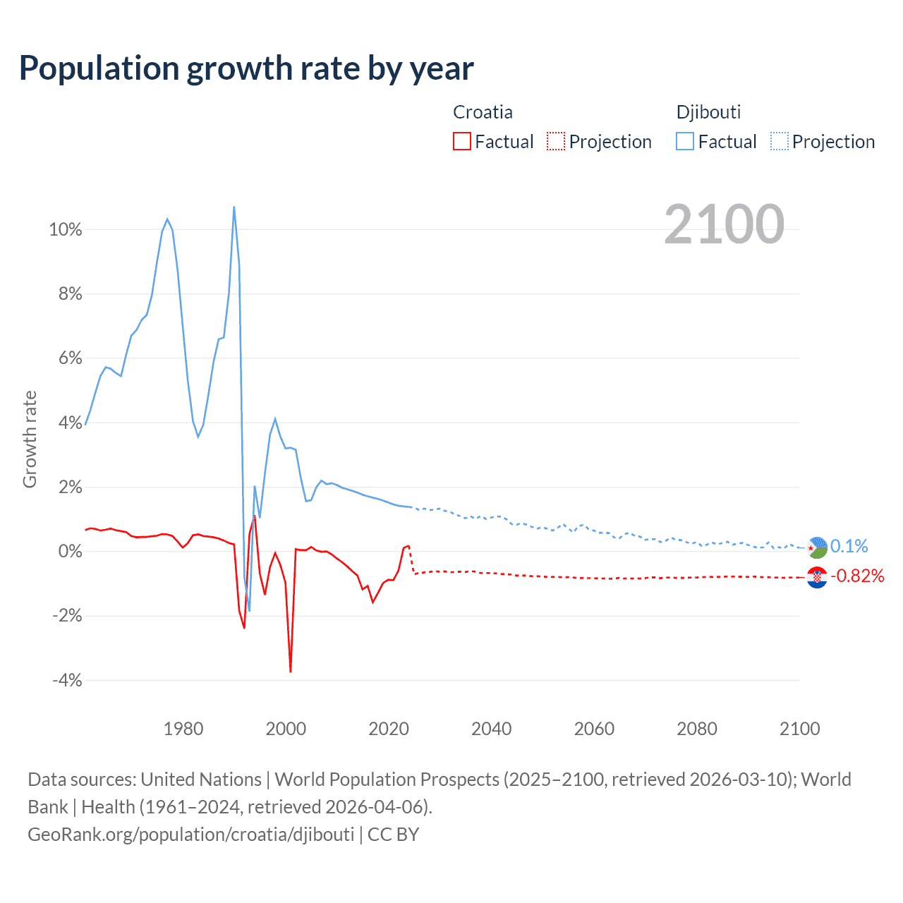 - For the last 10 years, Croatia has had an average growth rate of -0.82% per year vs +1.57% in Djibouti.