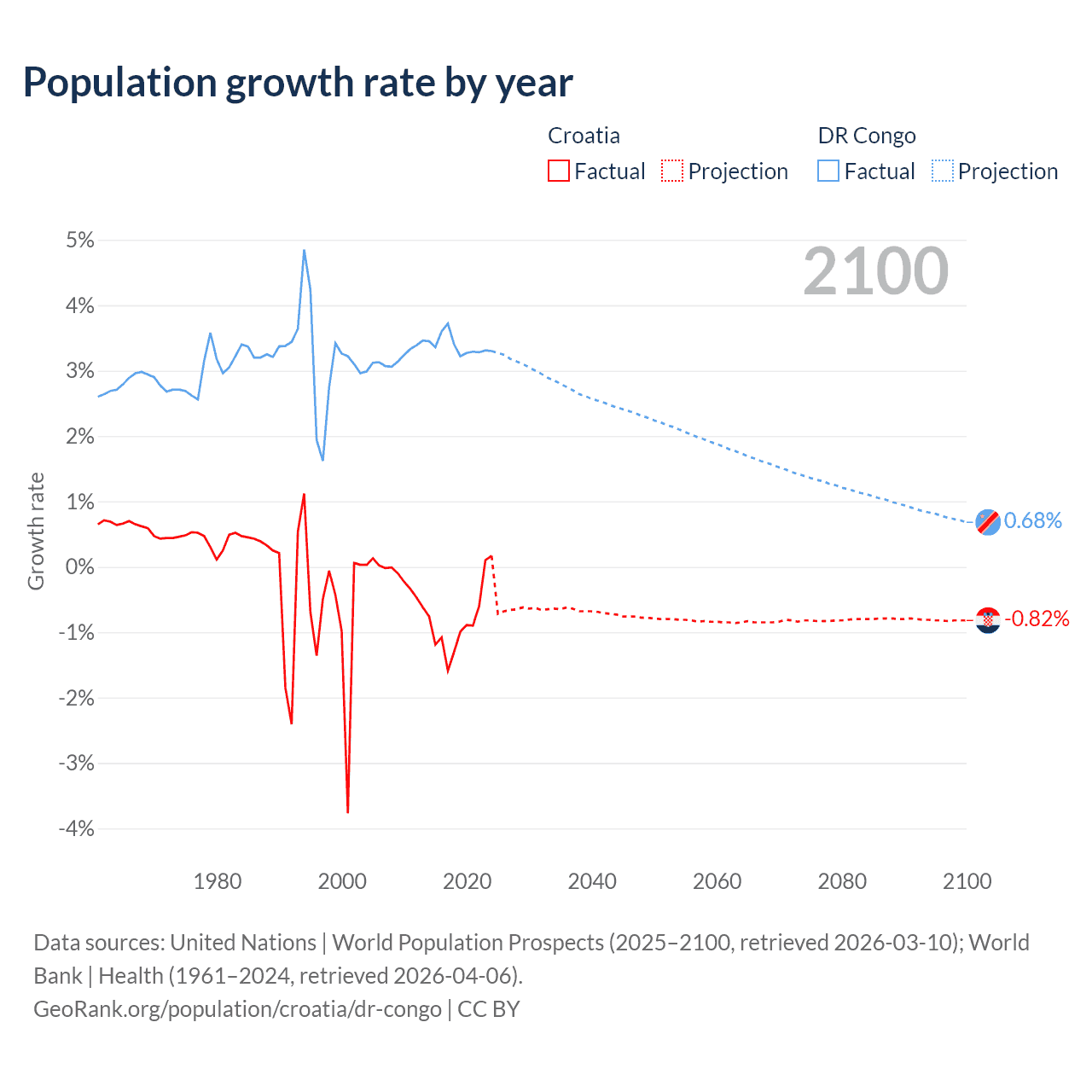 - For the last 10 years, Croatia has had an average growth rate of -0.82% per year vs +3.38% in the DR Congo.