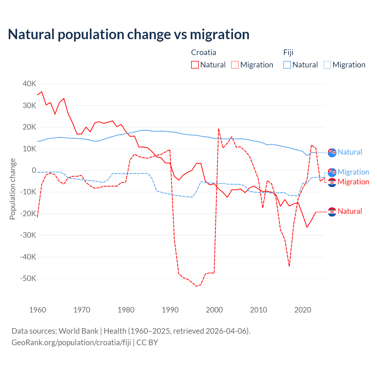 Over the last 10 years, 54.8% of the population change in Croatia is from natural causes (a loss of 177,803 people) and 45.2% is from migration (a loss of 146,770 people). In Fiji 52.6% is from natural causes (a gain of 94,971 people) and 47.4% is from migration (a loss of 85,415 people).