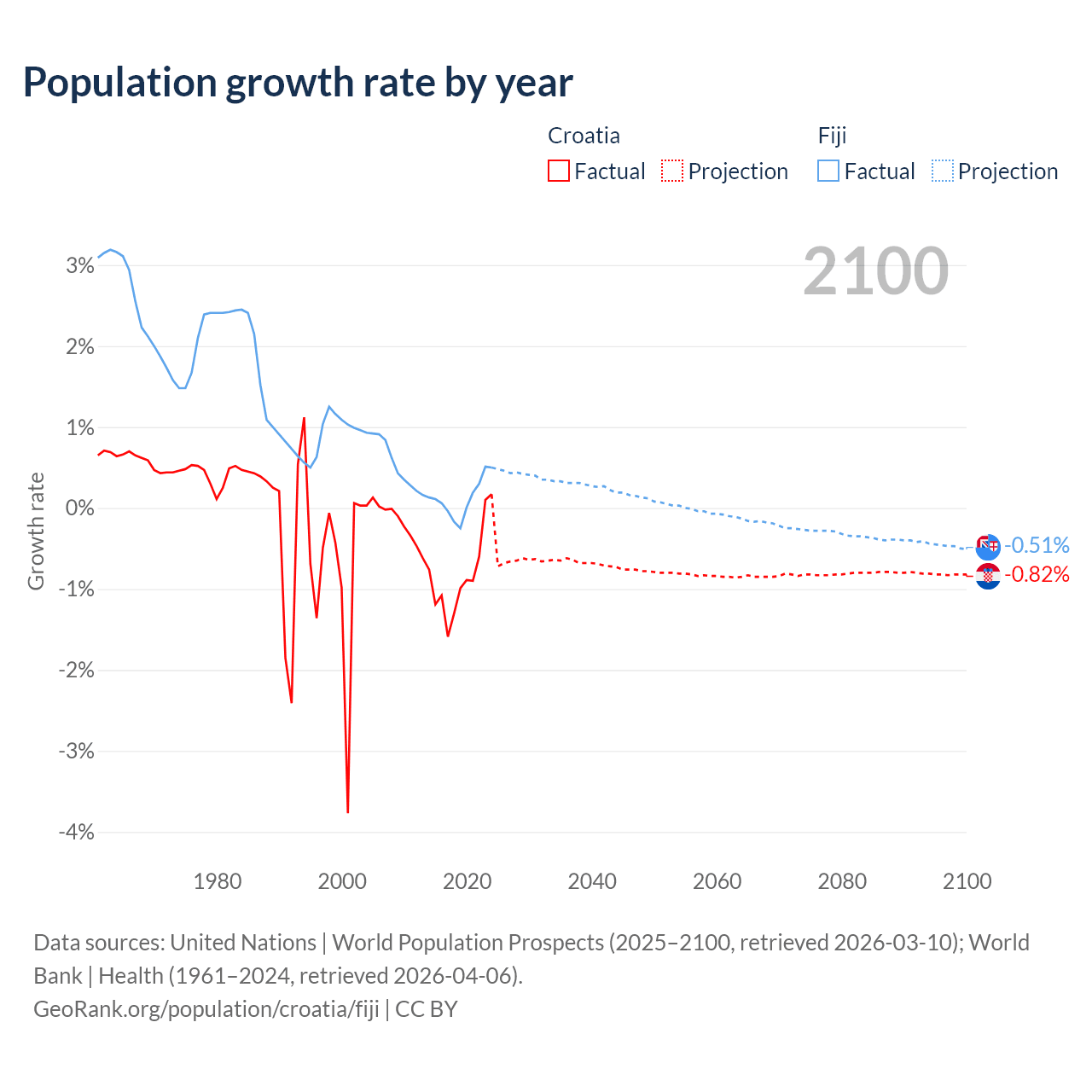 - For the last 10 years, Croatia has had an average growth rate of -0.82% per year vs +0.12% in Fiji.