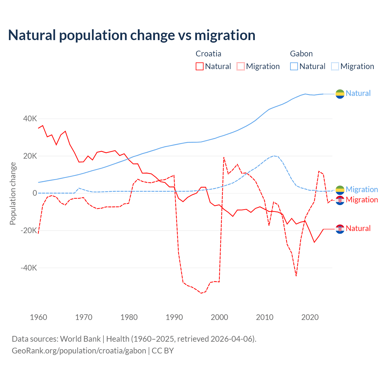 Over the last 10 years, 54.8% of the population change in Croatia is from natural causes (a loss of 177,803 people) and 45.2% is from migration (a loss of 146,770 people). In Gabon 91.1% is from natural causes (a gain of 515,484 people) and 8.86% is from migration (a gain of 50,119 people).