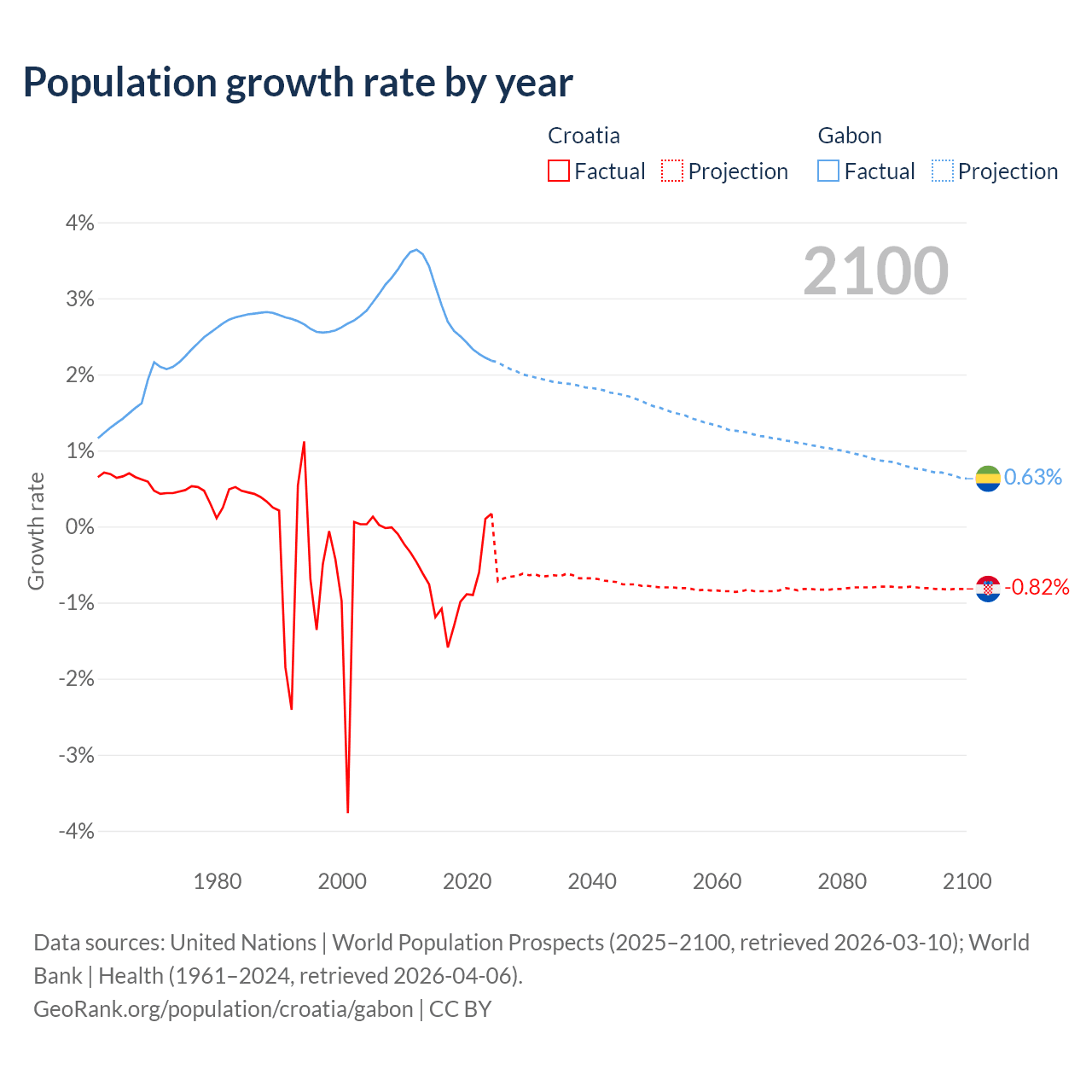- For the last 10 years, Croatia has had an average growth rate of -0.82% per year vs +2.61% in Gabon.