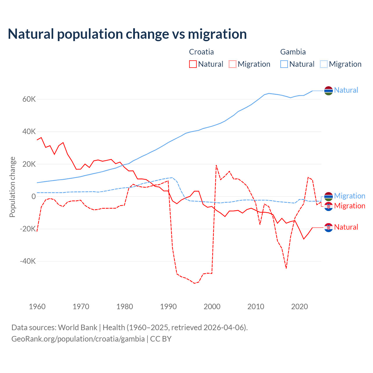 Over the last 10 years, 54.8% of the population change in Croatia is from natural causes (a loss of 177,803 people) and 45.2% is from migration (a loss of 146,770 people). In the Gambia 95.2% is from natural causes (a gain of 625,795 people) and 4.75% is from migration (a loss of 31,227 people).