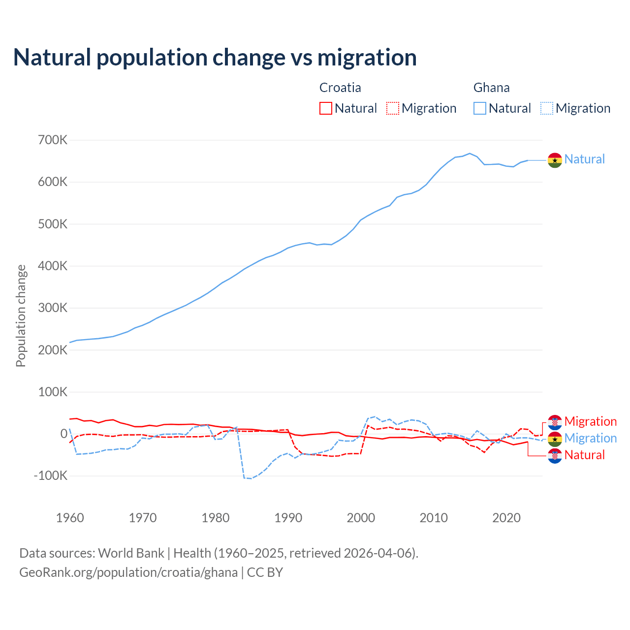 Over the last 10 years, 54.8% of the population change in Croatia is from natural causes (a loss of 177,803 people) and 45.2% is from migration (a loss of 146,770 people). In Ghana 98.6% is from natural causes (a gain of 6,484,449 people) and 1.37% is from migration (a loss of 90,310 people).