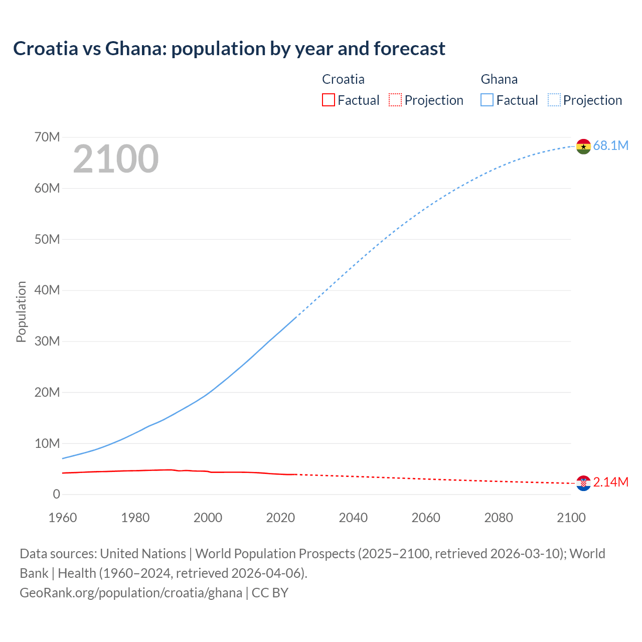 - Since 2006, the population of Croatia has decreased from 4.31M people to 3.81M (11.6% decline), while Ghana has grown from 23M to 35.9M (55.7% growth).