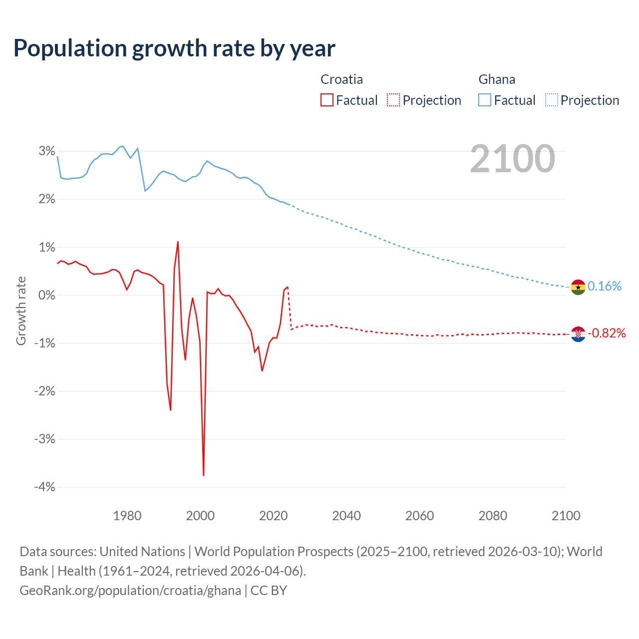 - For the last 10 years, Croatia has had an average growth rate of -0.82% per year vs +2.1% in Ghana.
