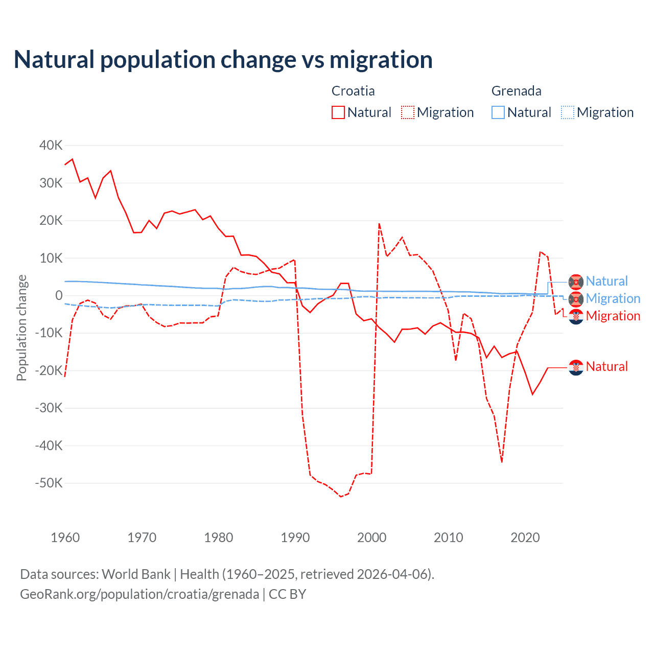Over the last 10 years, 54.8% of the population change in Croatia is from natural causes (a loss of 177,803 people) and 45.2% is from migration (a loss of 146,770 people). In Grenada 76% is from natural causes (a gain of 4,850 people) and 24% is from migration (a loss of 1,535 people).
