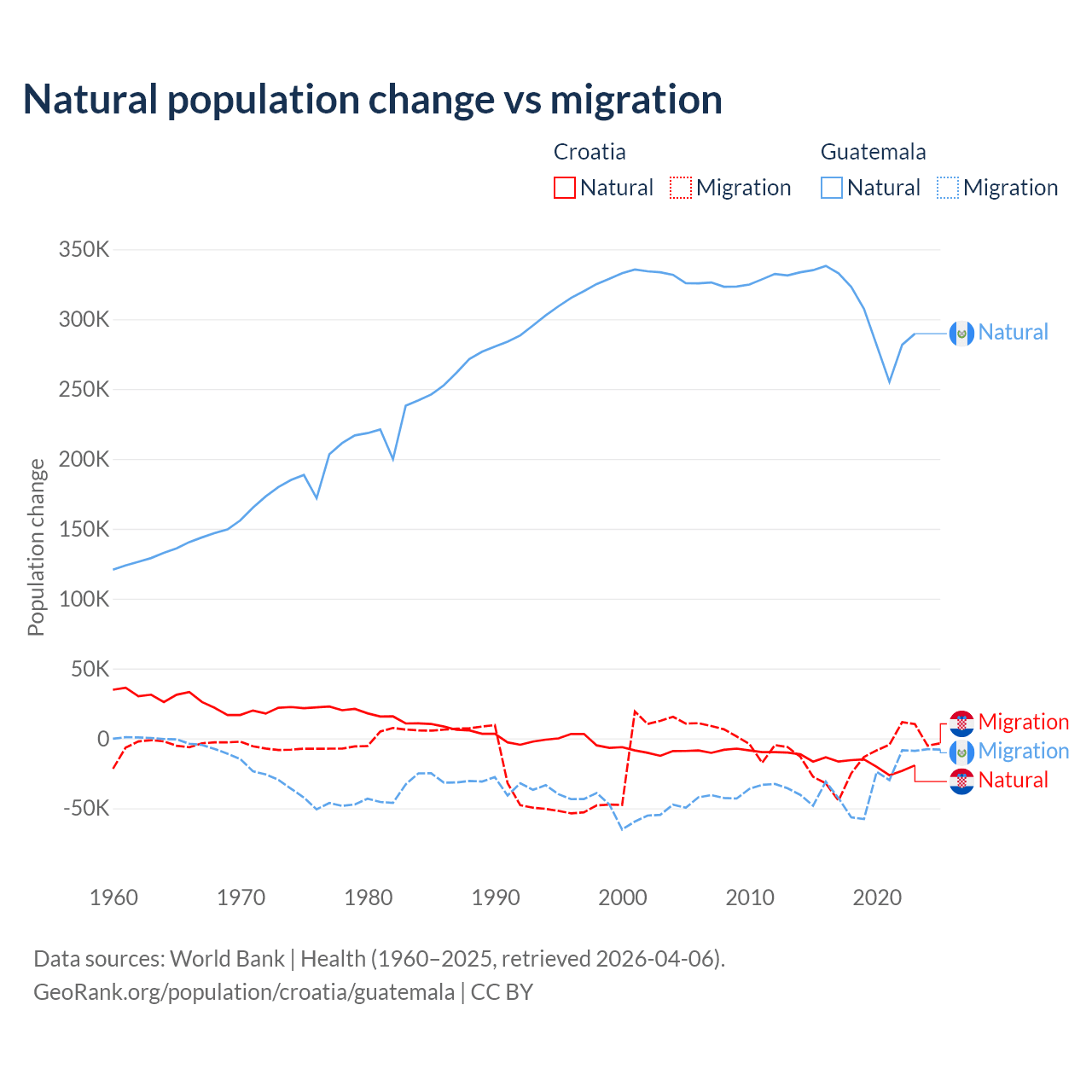 Over the last 10 years, 54.8% of the population change in Croatia is from natural causes (a loss of 177,803 people) and 45.2% is from migration (a loss of 146,770 people). In Guatemala 89.8% is from natural causes (a gain of 3,077,847 people) and 10.2% is from migration (a loss of 347,818 people).