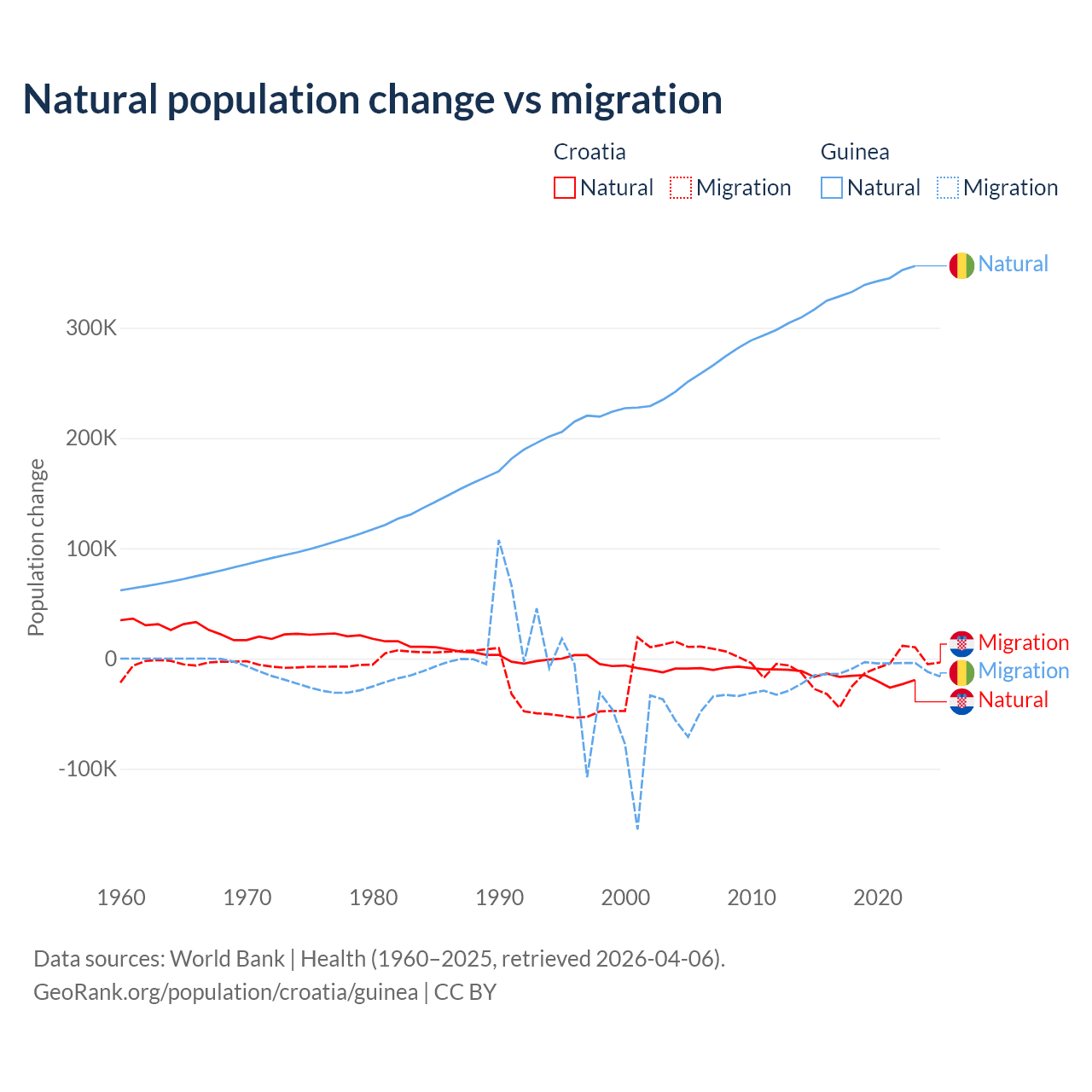Over the last 10 years, 54.8% of the population change in Croatia is from natural causes (a loss of 177,803 people) and 45.2% is from migration (a loss of 146,770 people). In Guinea 97.2% is from natural causes (a gain of 3,346,936 people) and 2.76% is from migration (a loss of 94,924 people).