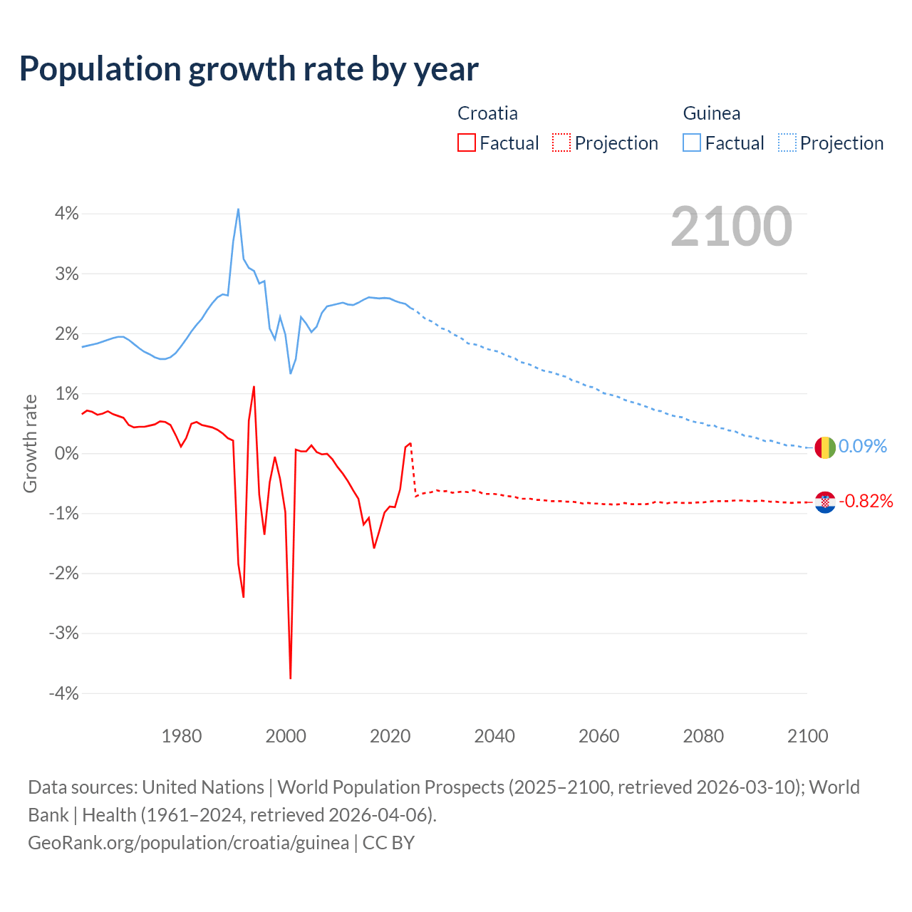 - For the last 10 years, Croatia has had an average growth rate of -0.82% per year vs +2.54% in Guinea.