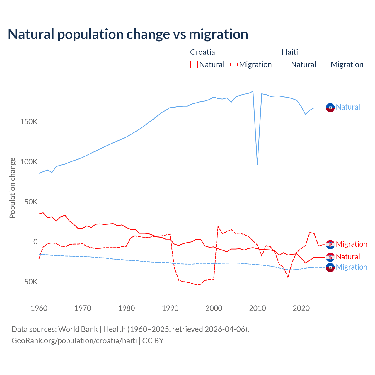 Over the last 10 years, 54.8% of the population change in Croatia is from natural causes (a loss of 177,803 people) and 45.2% is from migration (a loss of 146,770 people). In Haiti 83.9% is from natural causes (a gain of 1,740,319 people) and 16.1% is from migration (a loss of 333,076 people).