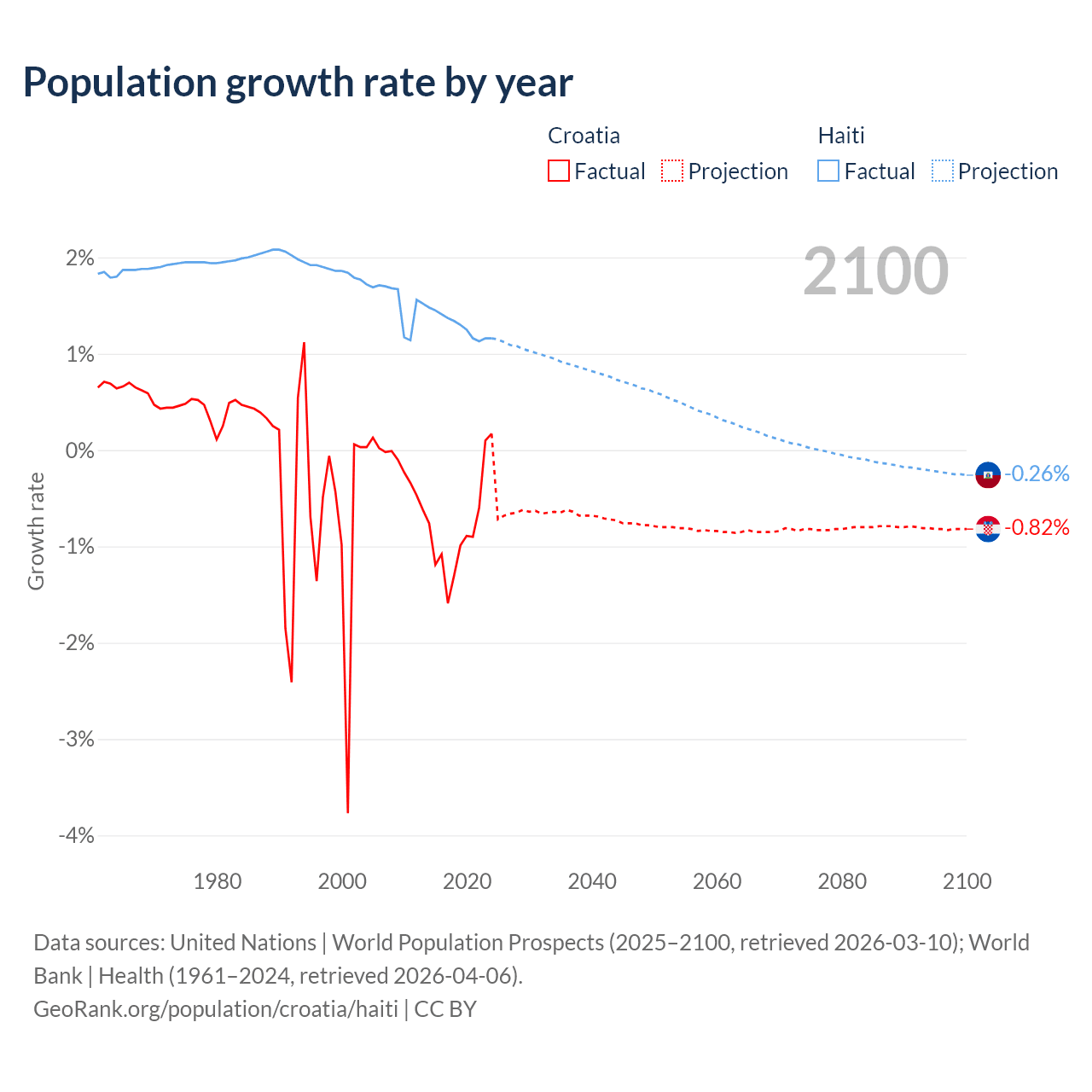 - For the last 10 years, Croatia has had an average growth rate of -0.82% per year vs +1.29% in Haiti.