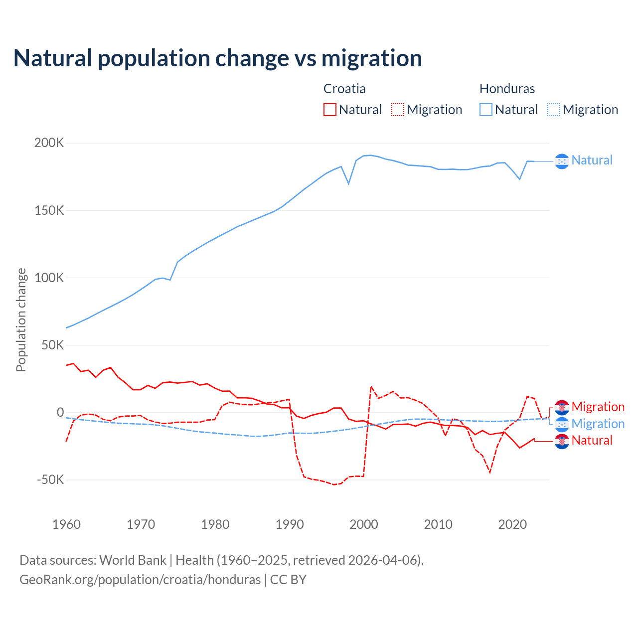 Over the last 10 years, 54.8% of the population change in Croatia is from natural causes (a loss of 177,803 people) and 45.2% is from migration (a loss of 146,770 people). In Honduras 96.7% is from natural causes (a gain of 1,821,125 people) and 3.29% is from migration (a loss of 61,965 people).