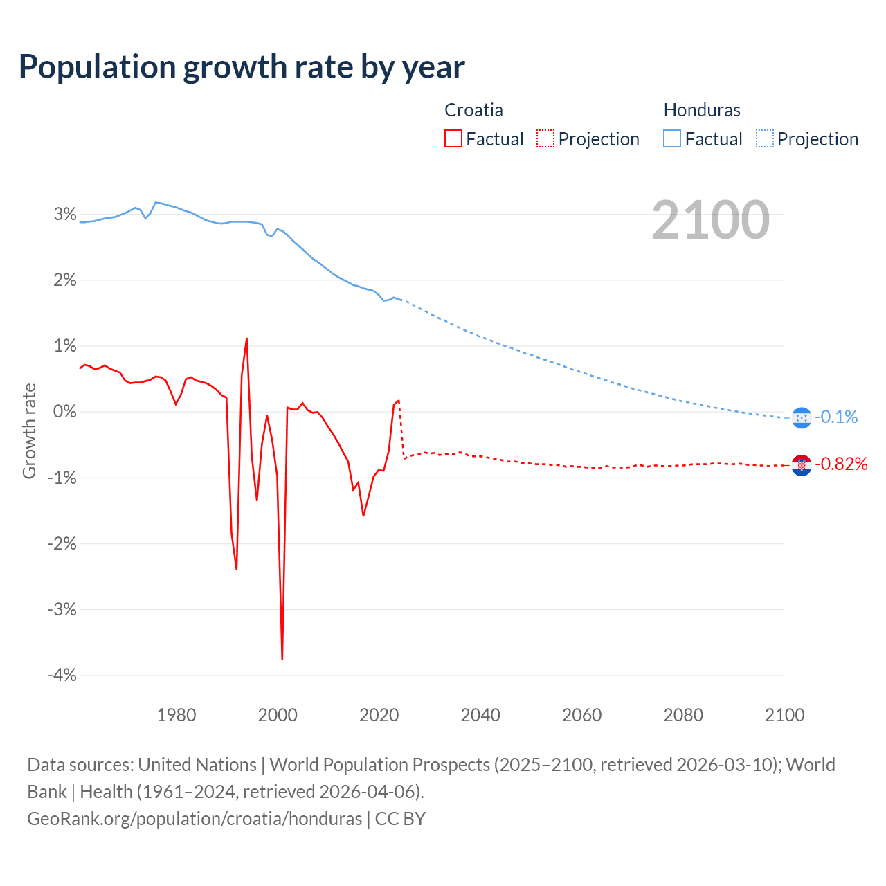 - For the last 10 years, Croatia has had an average growth rate of -0.82% per year vs +1.81% in Honduras.