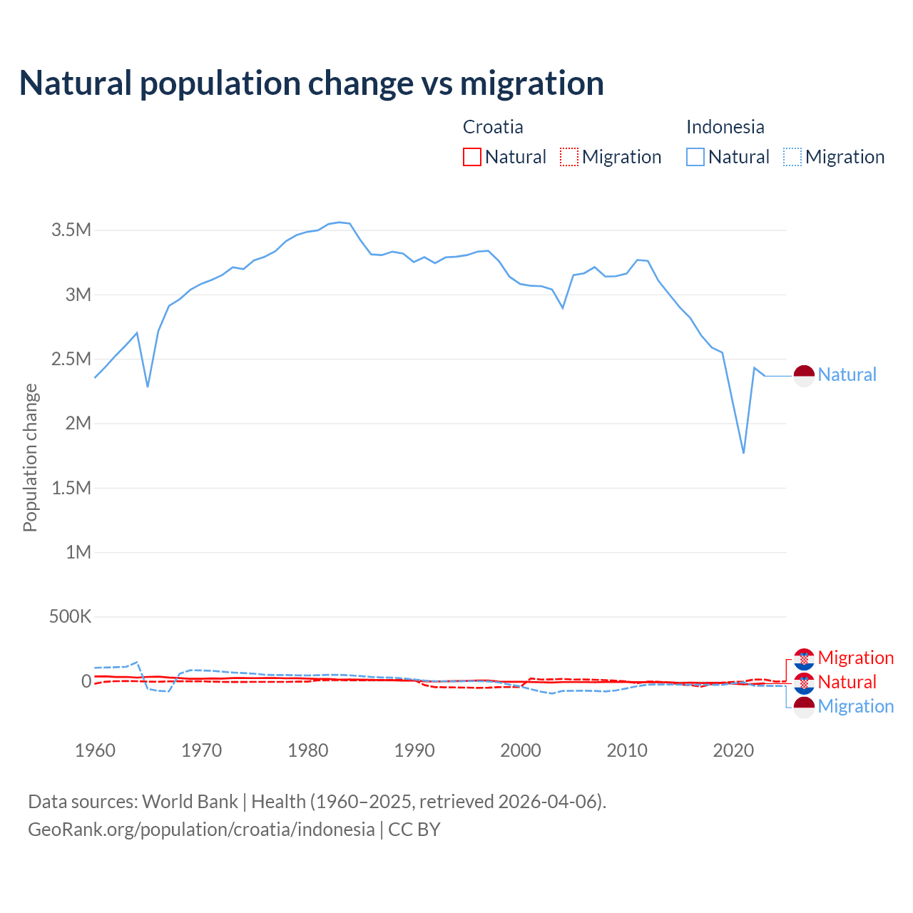 Over the last 10 years, 54.8% of the population change in Croatia is from natural causes (a loss of 177,803 people) and 45.2% is from migration (a loss of 146,770 people). In Indonesia 98.9% is from natural causes (a gain of 25,242,860 people) and 1.1% is from migration (a loss of 280,258 people).