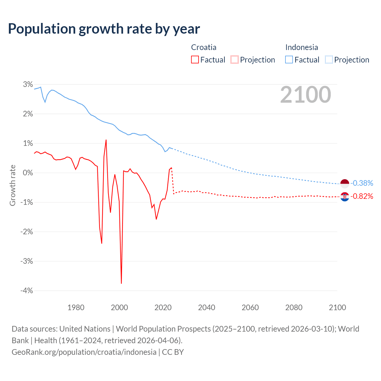 - For the last 10 years, Croatia has had an average growth rate of -0.82% per year vs +0.94% in Indonesia.