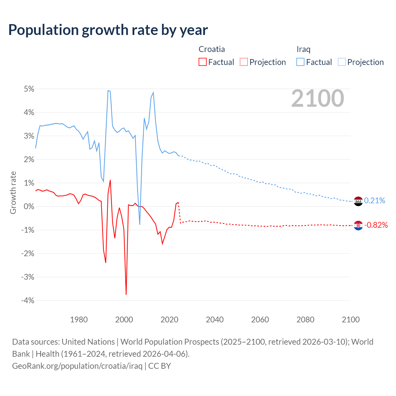 - For the last 10 years, Croatia has had an average growth rate of -0.82% per year vs +2.45% in Iraq.