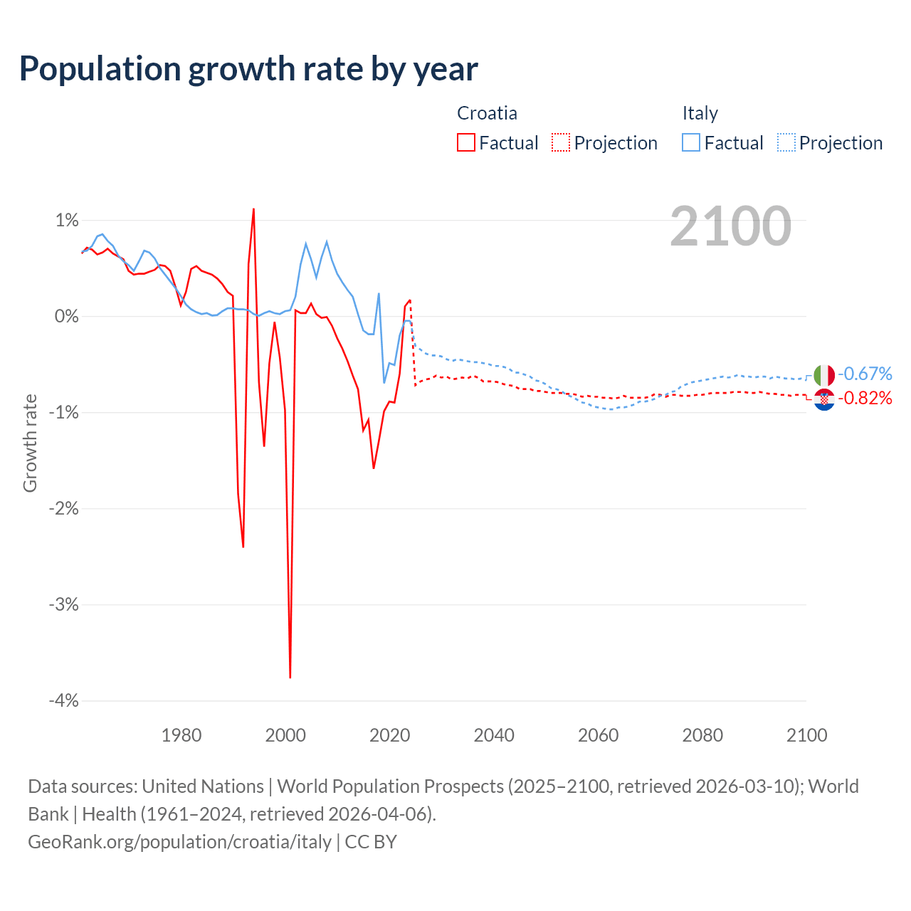 - For the last 10 years, Croatia has had an average growth rate of -0.82% per year vs -0.21% in Italy.