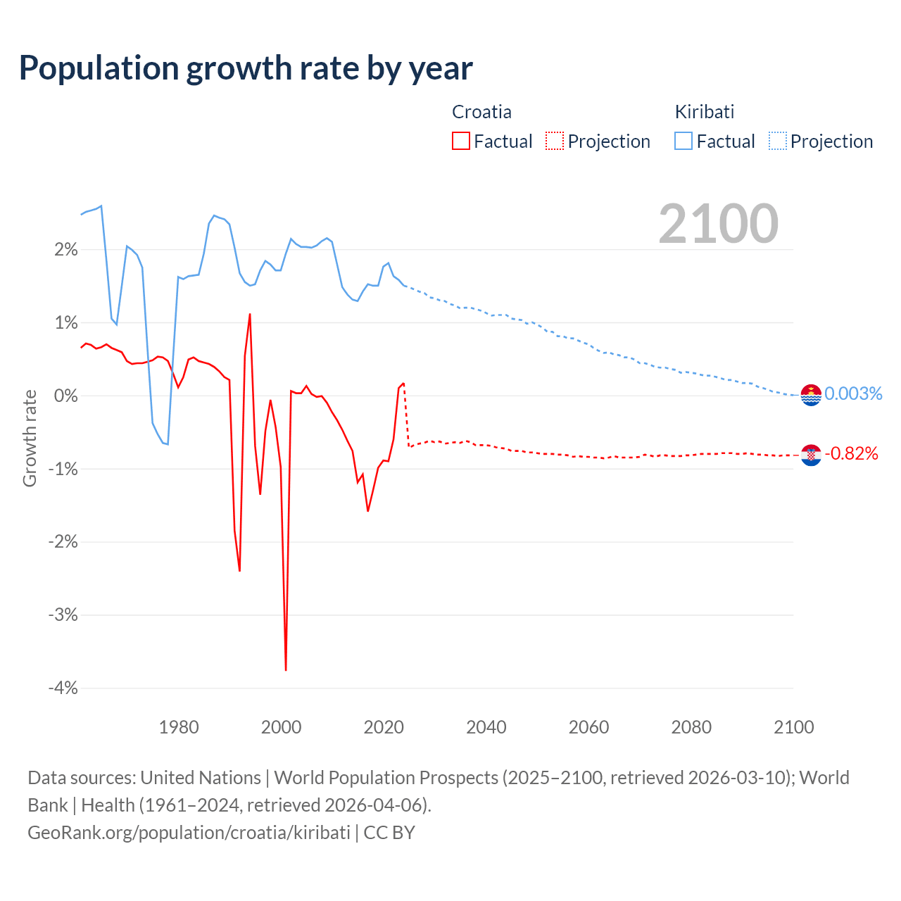 - For the last 10 years, Croatia has had an average growth rate of -0.82% per year vs +1.53% in Kiribati.