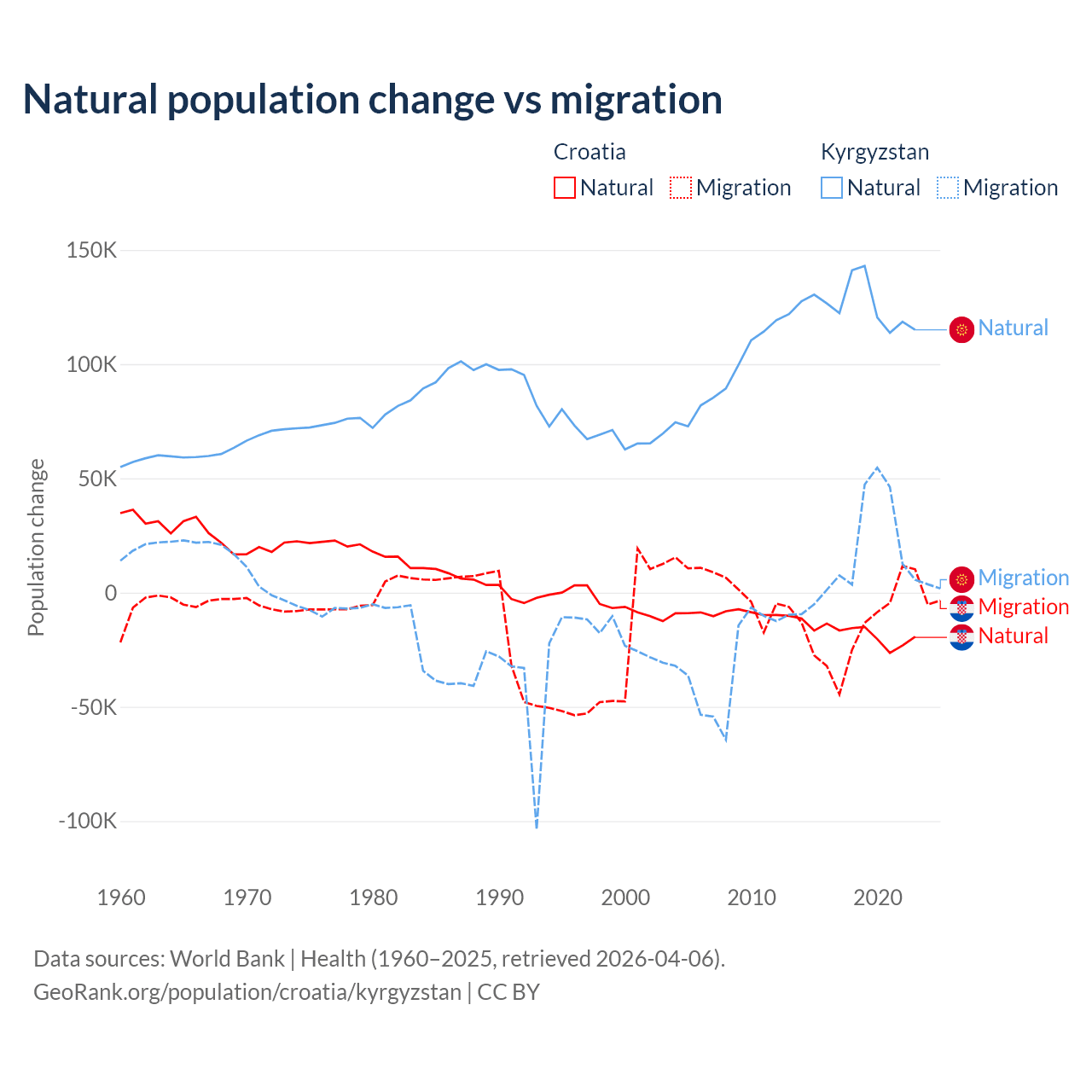 Over the last 10 years, 54.8% of the population change in Croatia is from natural causes (a loss of 177,803 people) and 45.2% is from migration (a loss of 146,770 people). In Kyrgyzstan 88.5% is from natural causes (a gain of 1,258,837 people) and 11.5% is from migration (a gain of 164,132 people).