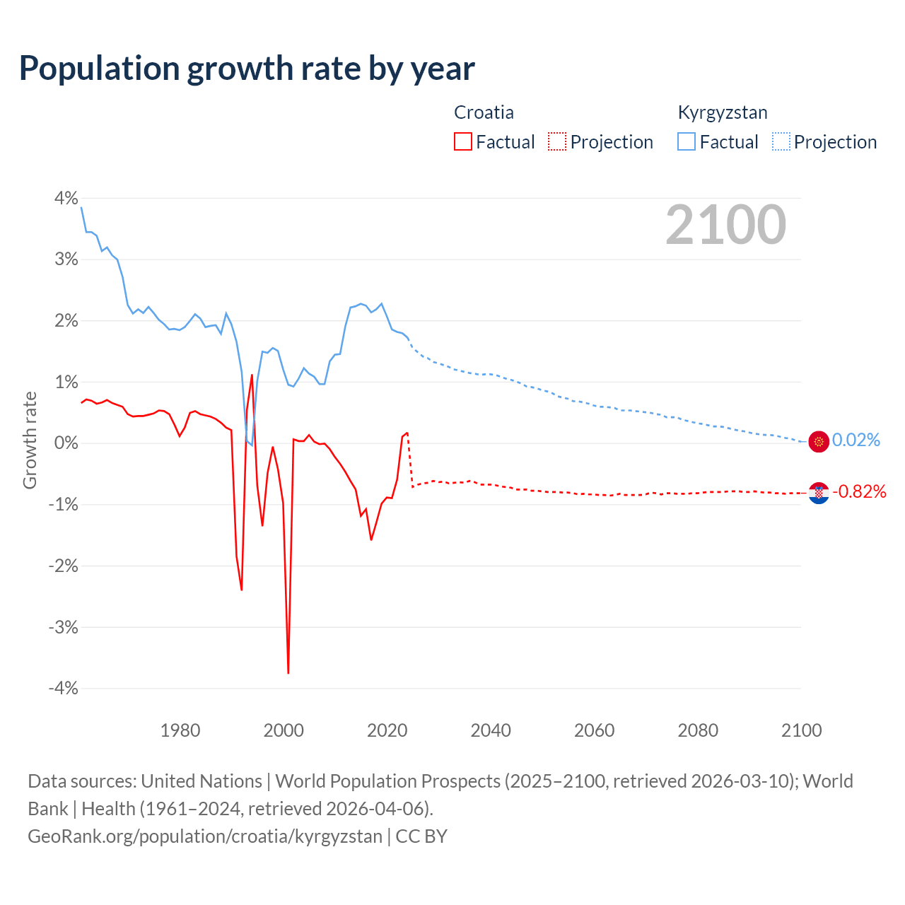 - For the last 10 years, Croatia has had an average growth rate of -0.82% per year vs +2.05% in Kyrgyzstan.