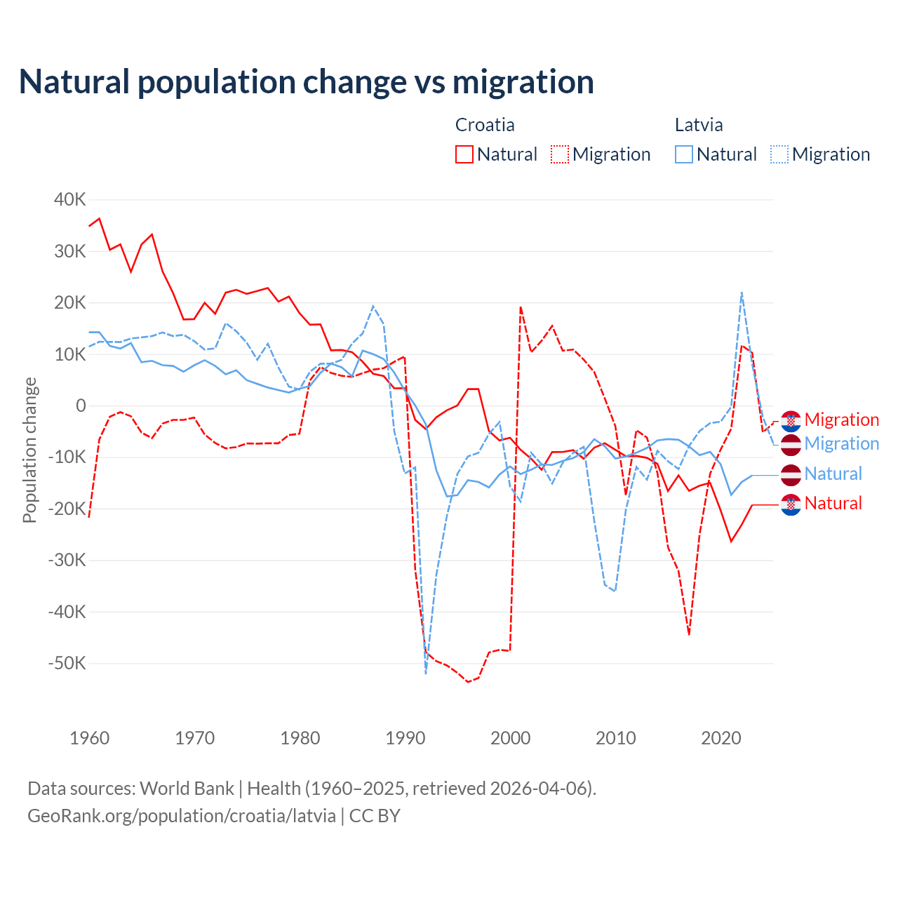 Over the last 10 years, 54.8% of the population change in Croatia is from natural causes (a loss of 177,803 people) and 45.2% is from migration (a loss of 146,770 people). In Latvia 82.7% is from natural causes (a loss of 103,711 people) and 17.3% is from migration (a loss of 21,641 people).