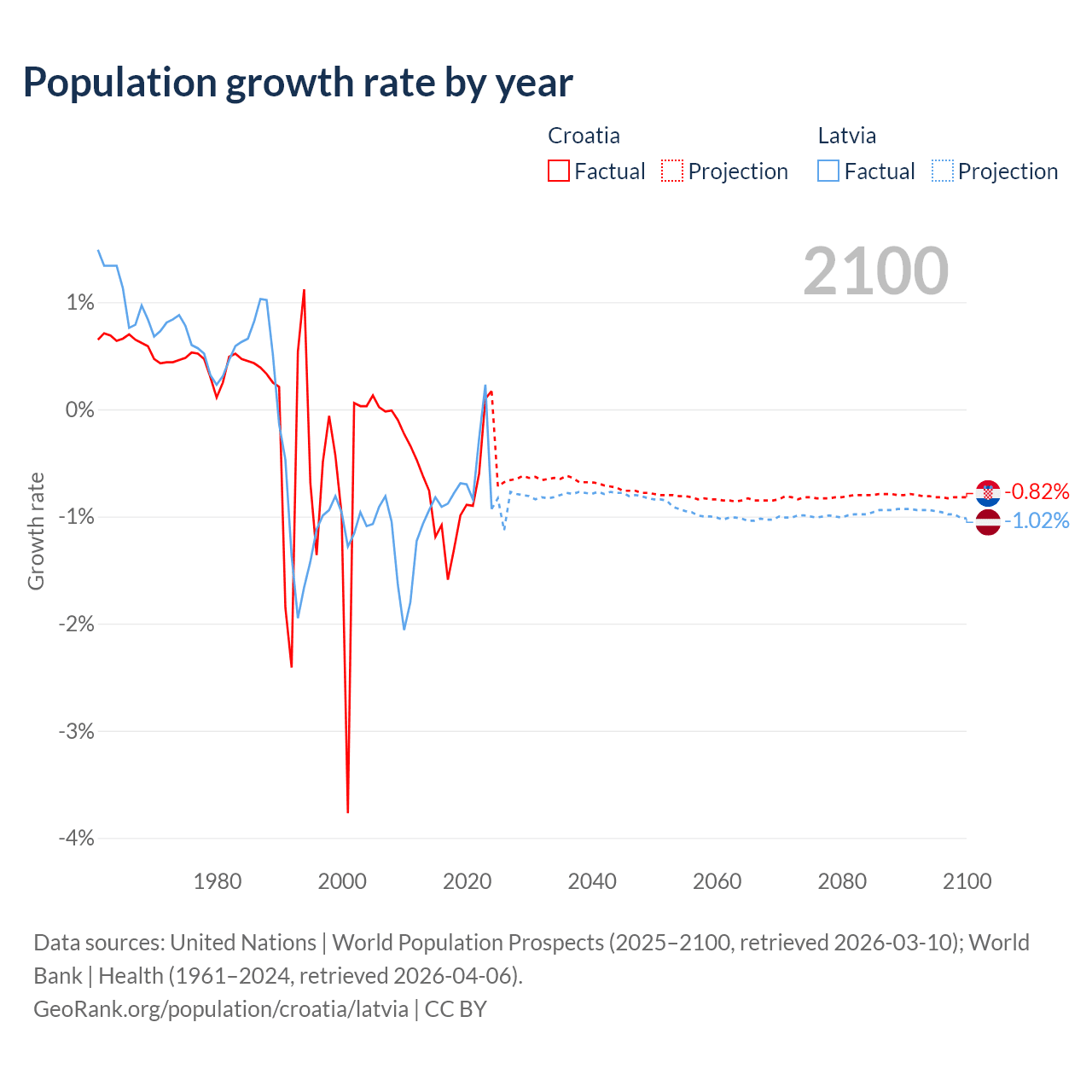 - For the last 10 years, Croatia has had an average growth rate of -0.82% per year vs -0.68% in Latvia.