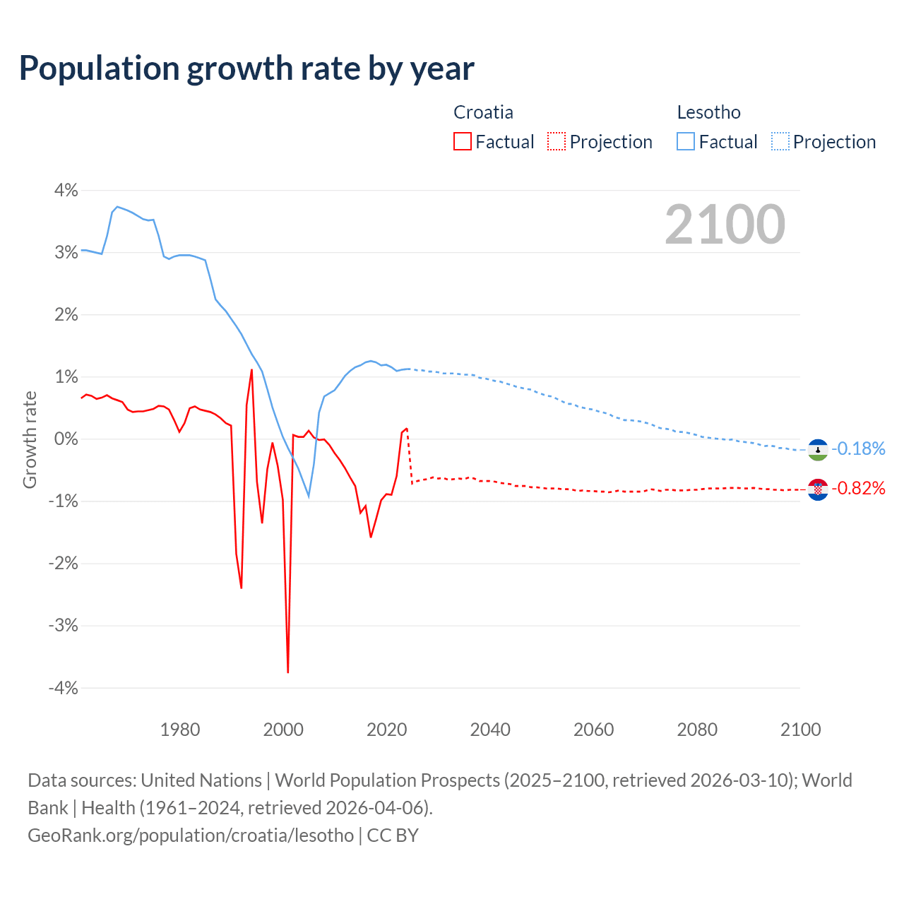 - For the last 10 years, Croatia has had an average growth rate of -0.82% per year vs +1.17% in Lesotho.
