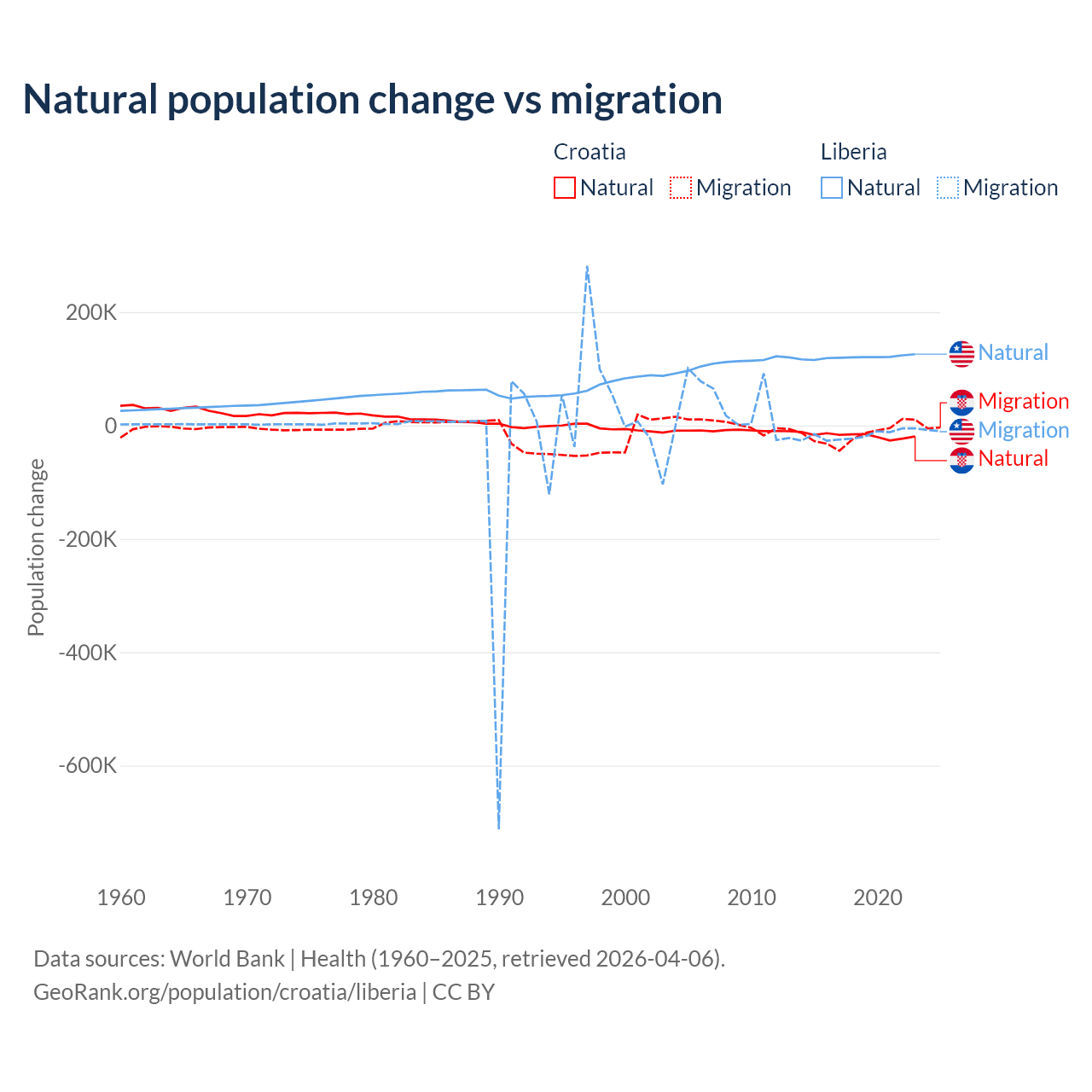Over the last 10 years, 54.8% of the population change in Croatia is from natural causes (a loss of 177,803 people) and 45.2% is from migration (a loss of 146,770 people). In Liberia 87.7% is from natural causes (a gain of 1,202,387 people) and 12.3% is from migration (a loss of 168,316 people).