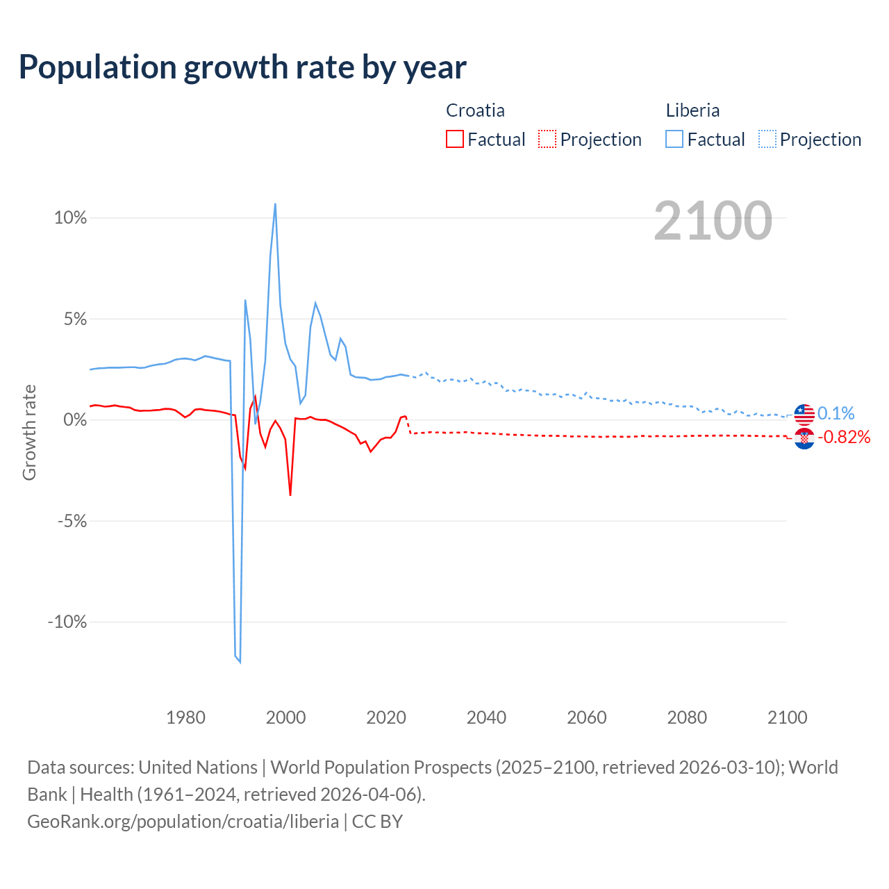 - For the last 10 years, Croatia has had an average growth rate of -0.82% per year vs +2.09% in Liberia.