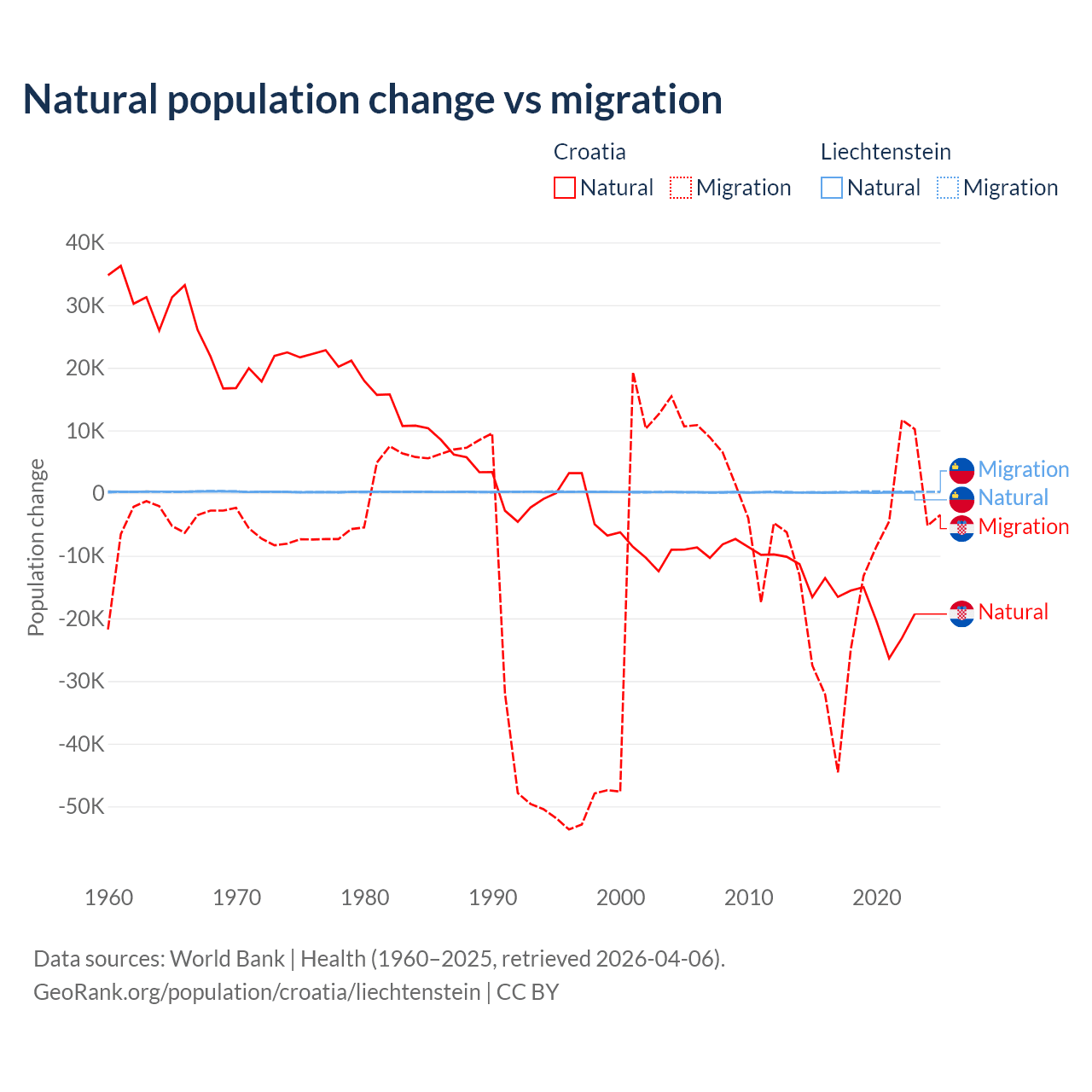 Over the last 10 years, 54.8% of the population change in Croatia is from natural causes (a loss of 177,803 people) and 45.2% is from migration (a loss of 146,770 people). In Liechtenstein 32.4% is from natural causes (a gain of 883 people) and 67.6% is from migration (a gain of 1,843 people).