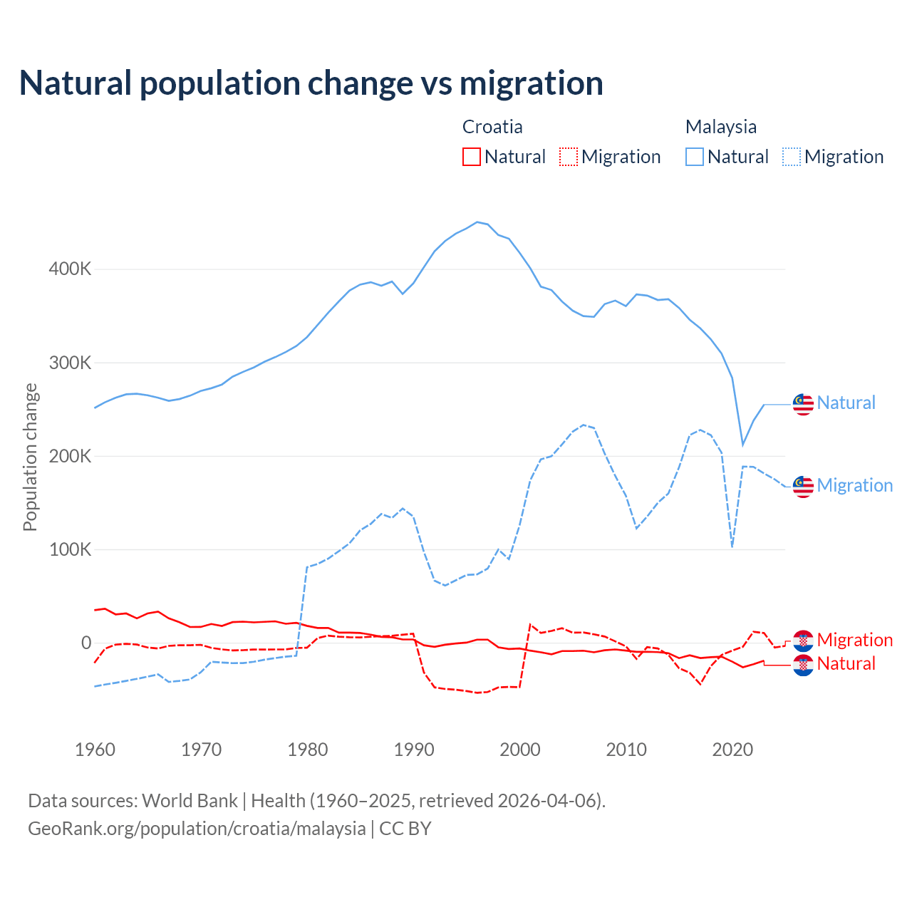 Over the last 10 years, 54.8% of the population change in Croatia is from natural causes (a loss of 177,803 people) and 45.2% is from migration (a loss of 146,770 people). In Malaysia 61.7% is from natural causes (a gain of 3,029,648 people) and 38.3% is from migration (a gain of 1,882,159 people).