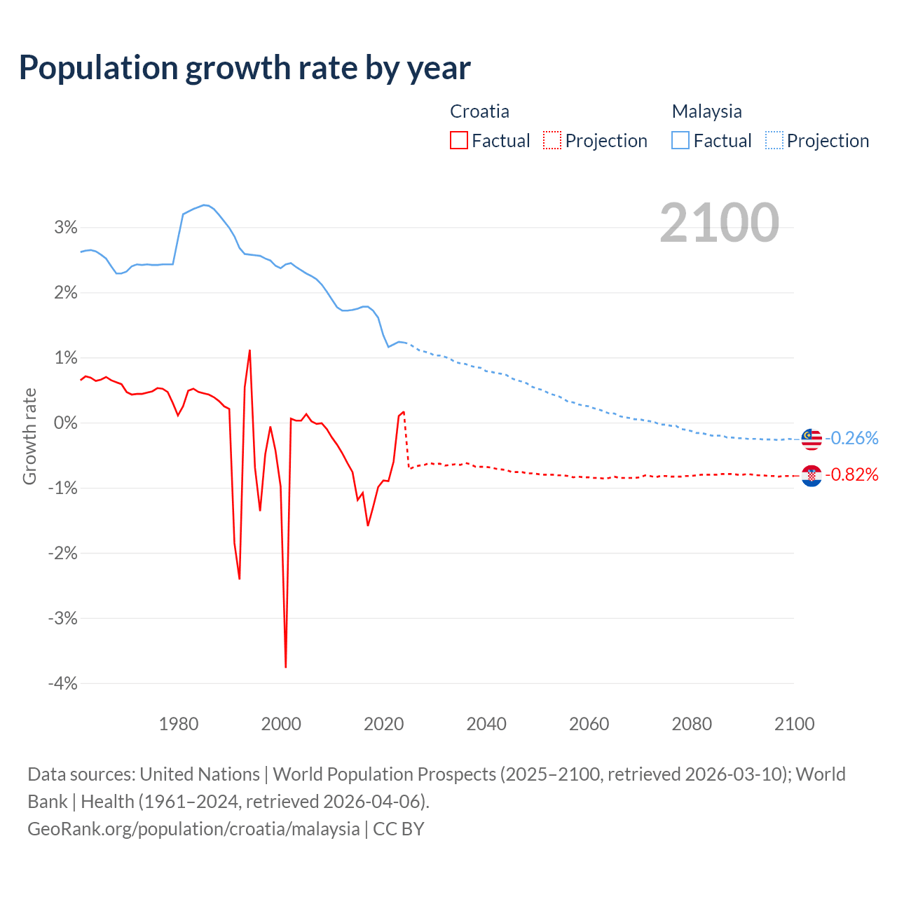 - For the last 10 years, Croatia has had an average growth rate of -0.82% per year vs +1.5% in Malaysia.