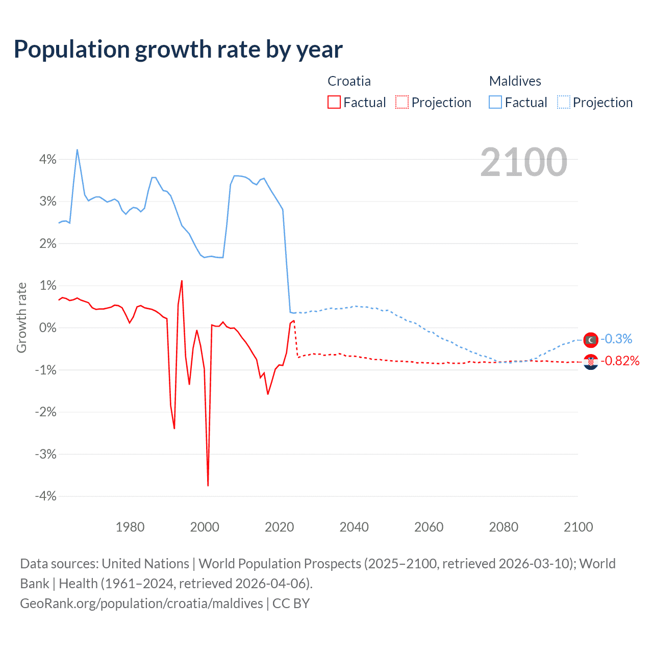 - For the last 10 years, Croatia has had an average growth rate of -0.82% per year vs +2.56% in Maldives.