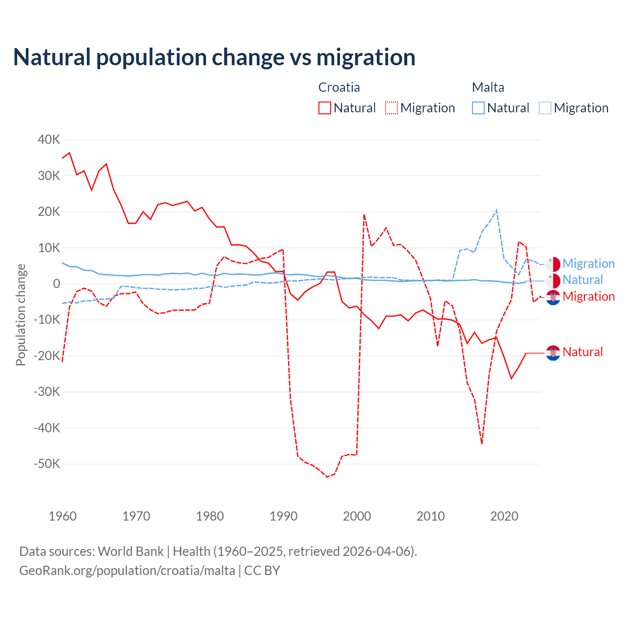 Over the last 10 years, 54.8% of the population change in Croatia is from natural causes (a loss of 177,803 people) and 45.2% is from migration (a loss of 146,770 people). In Malta 5.84% is from natural causes (a gain of 6,181 people) and 94.2% is from migration (a gain of 99,652 people).