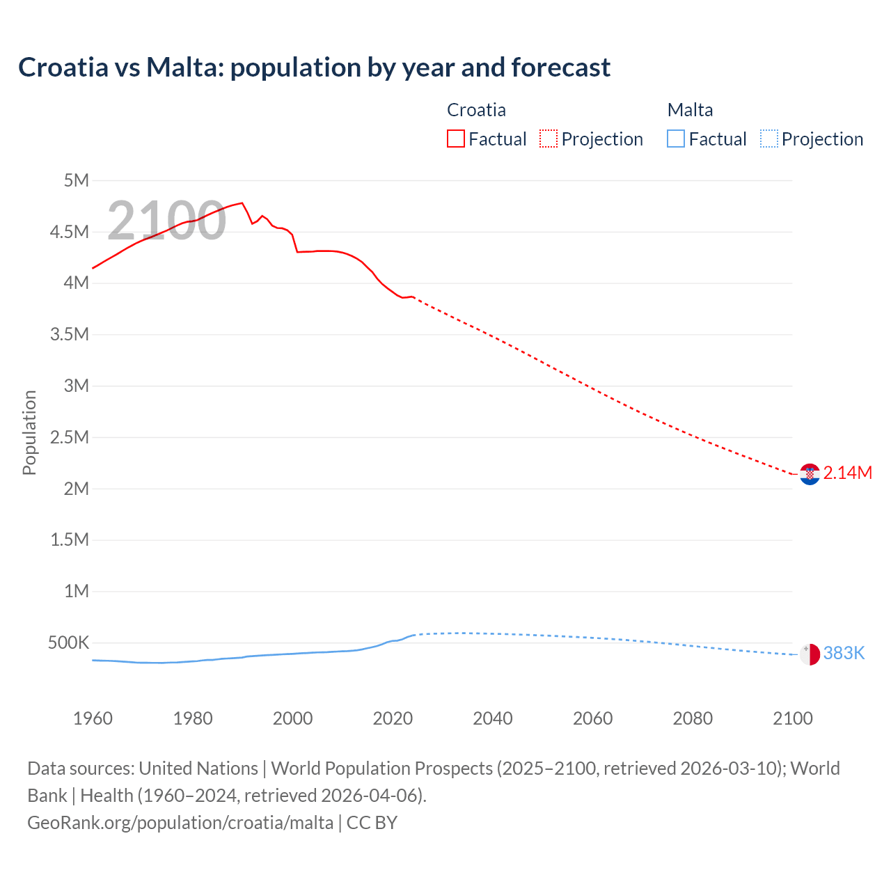 Croatia vs Malta: population by year and forecast