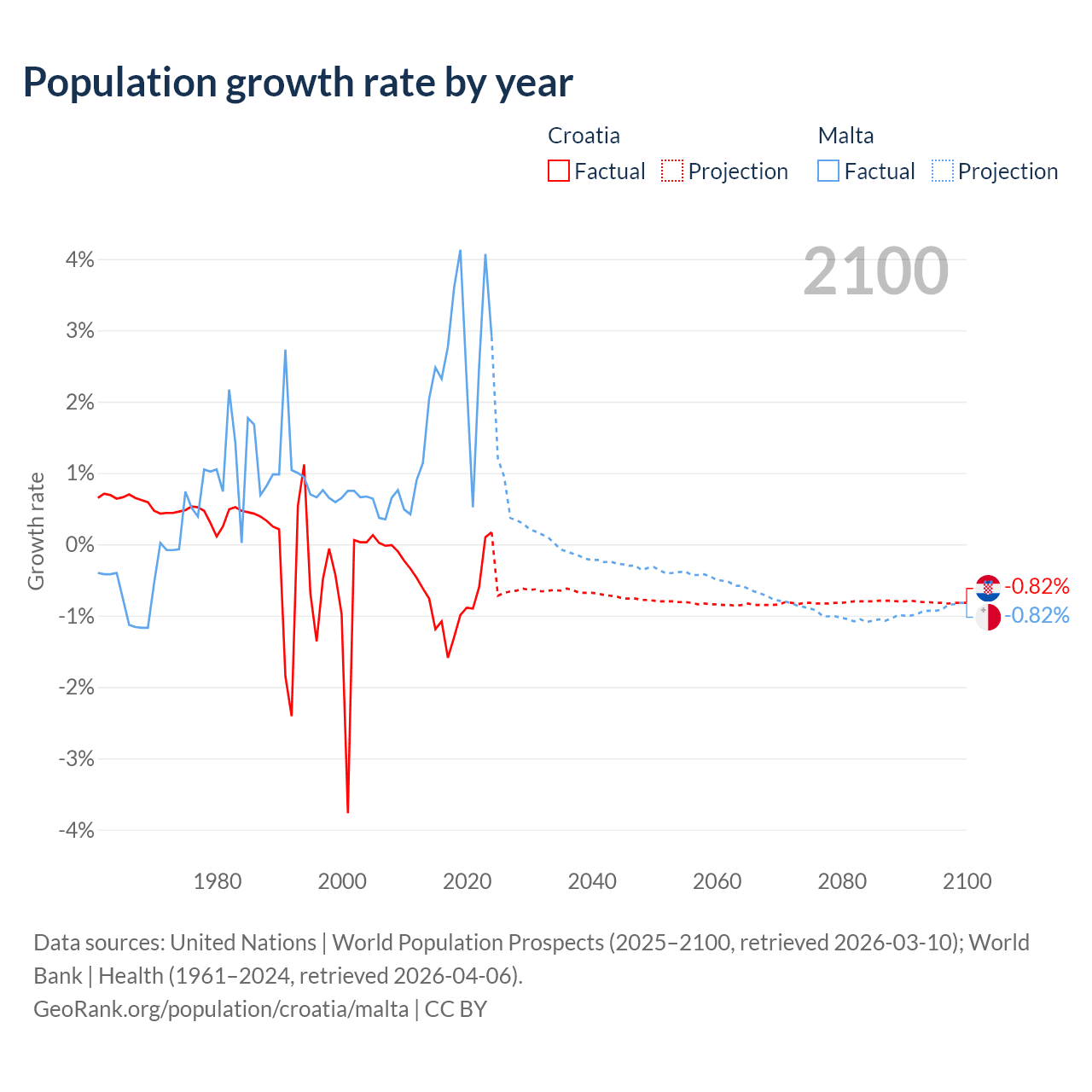 - For the last 10 years, Croatia has had an average growth rate of -0.82% per year vs +2.69% in Malta.
